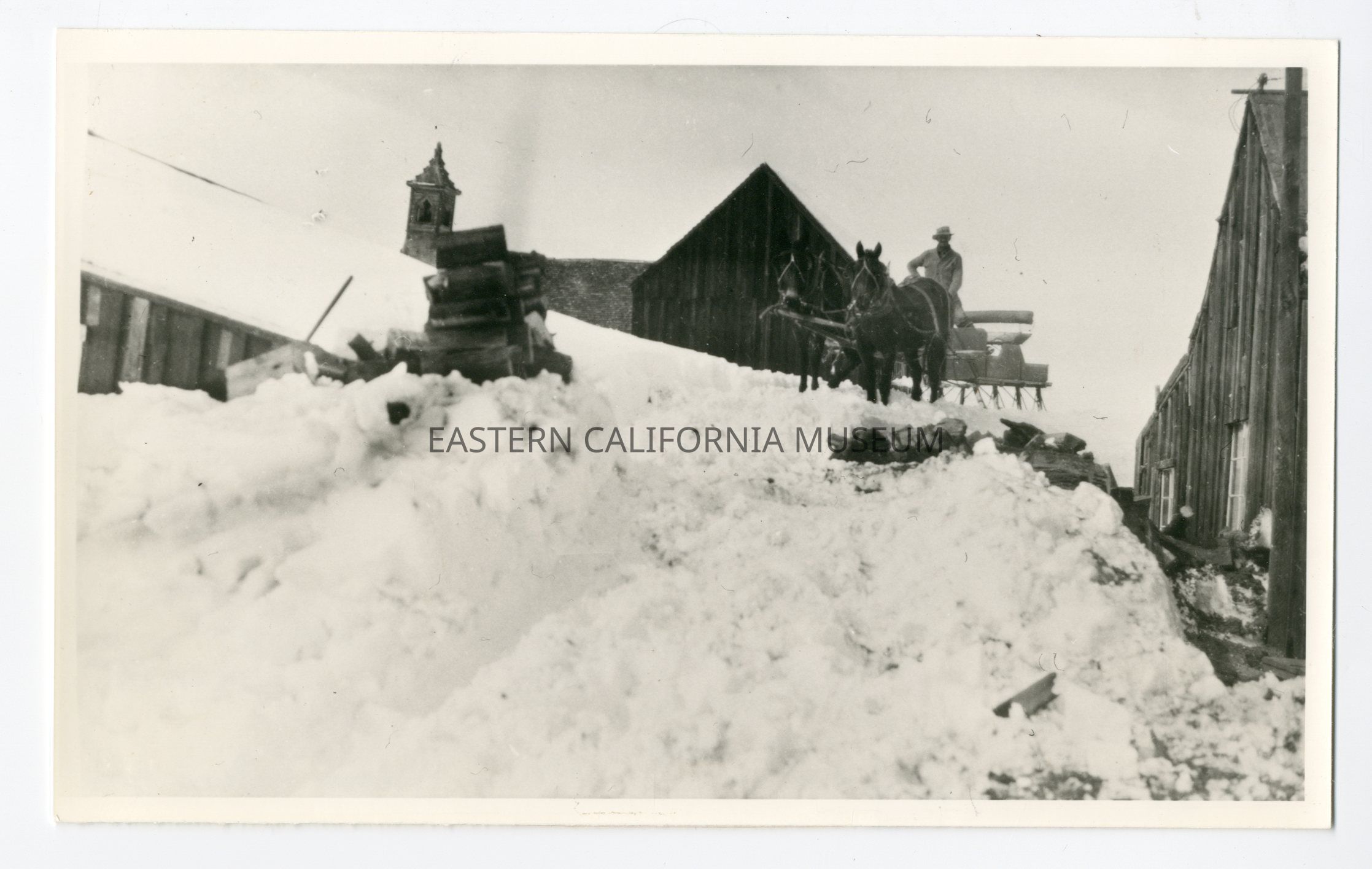 Photo of a man in a horse-drawn sled on top of a huge pile of snow. Buildings are visible around him. Written on reverse: Mono Lake. A. McK.