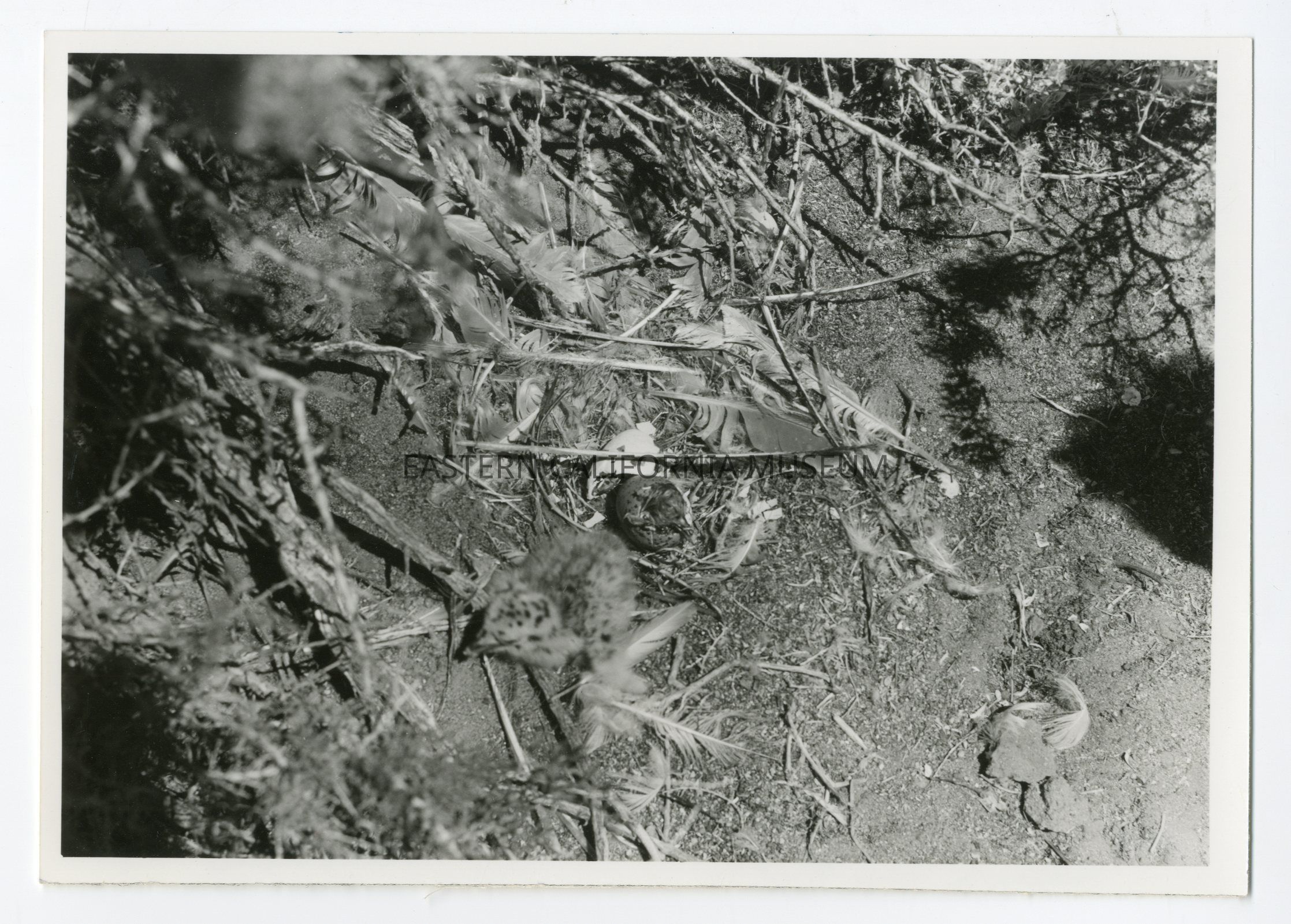 Photo of a newly hatched bird or chick. There are lots of feathers on the ground and a broken egg shell. Written on reverse: Mono Trail. H. J.