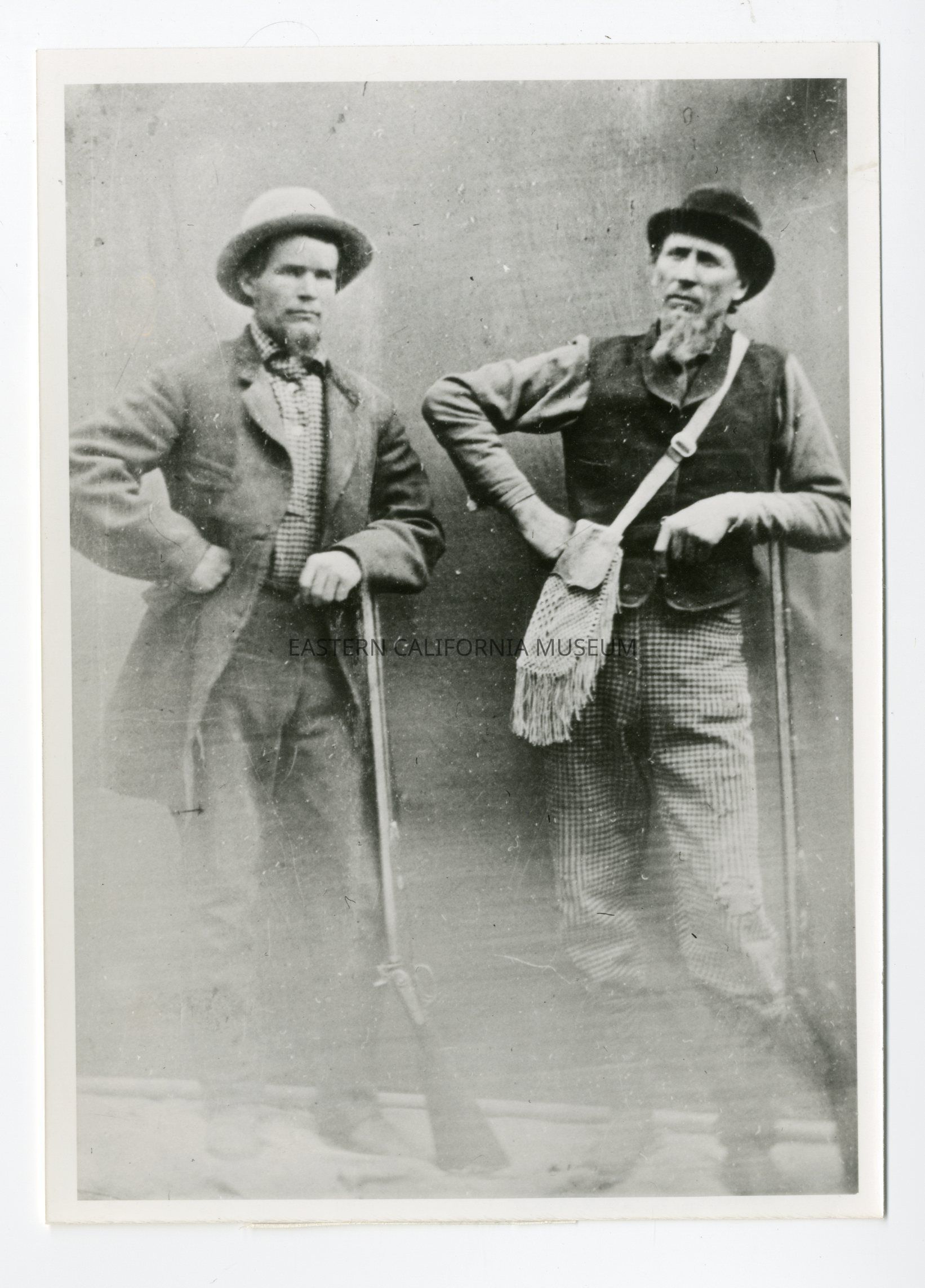 Mock studio portrait of two men leaning on their rifles. Written on reverse: Cattle Trails.