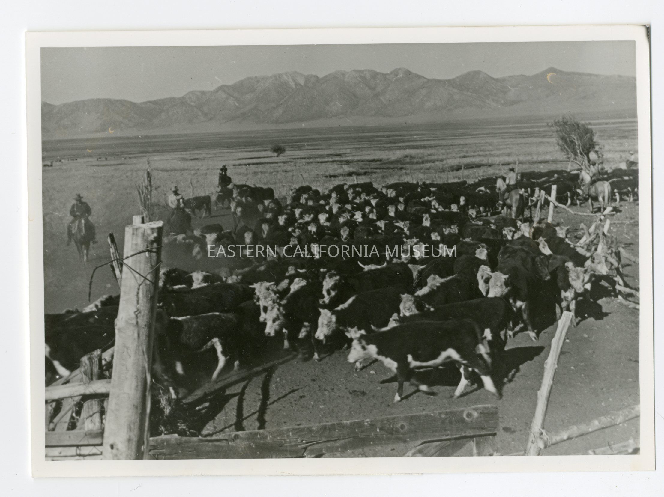 Photo of a herd of cattle with several cowboys. There is a wooden fence in the foreground. Written on reverse: Cattlemen. L. C.