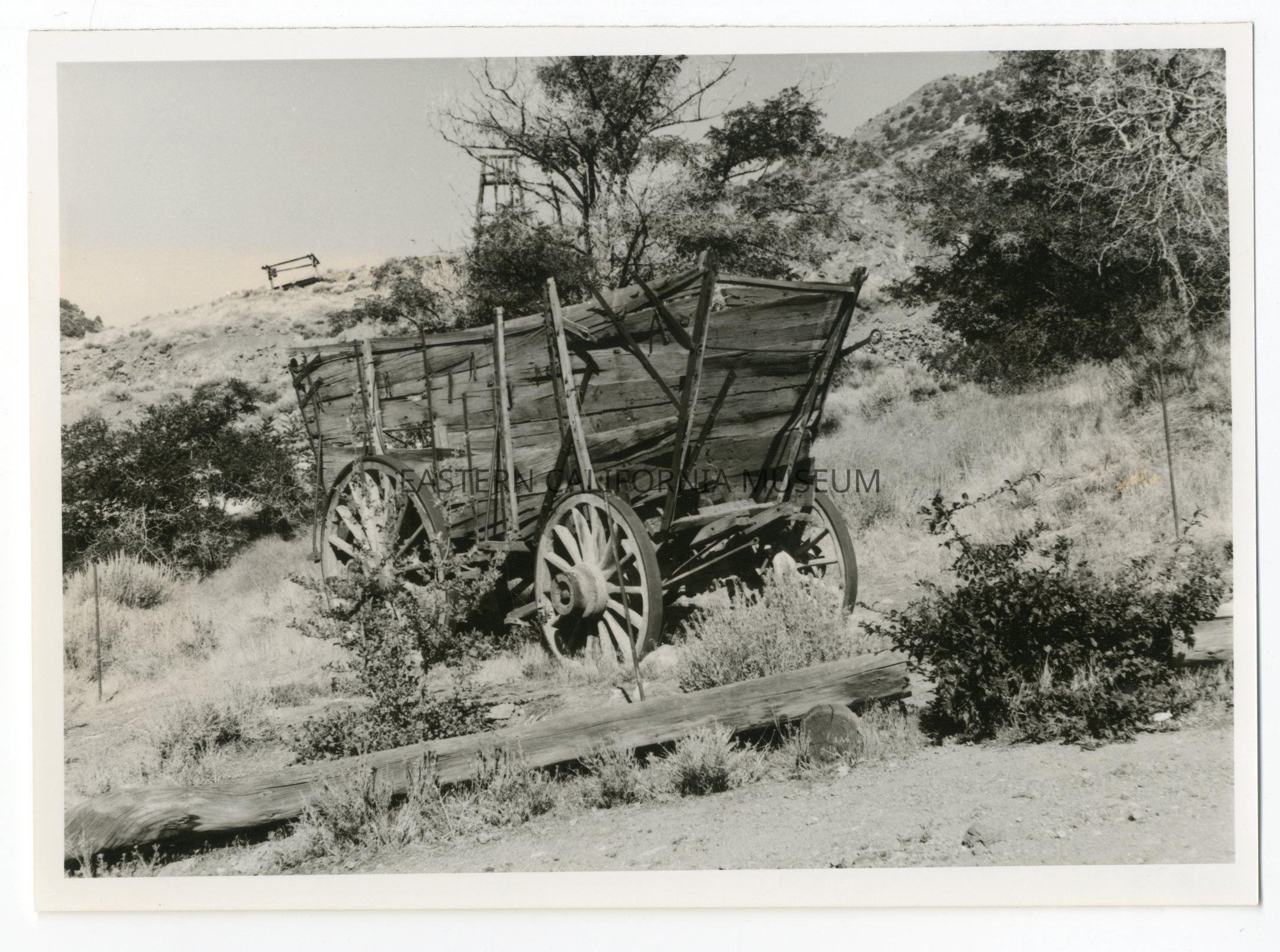 Photo of an old wagon on a hillside. Written on reverse: Bridgeport Valley.