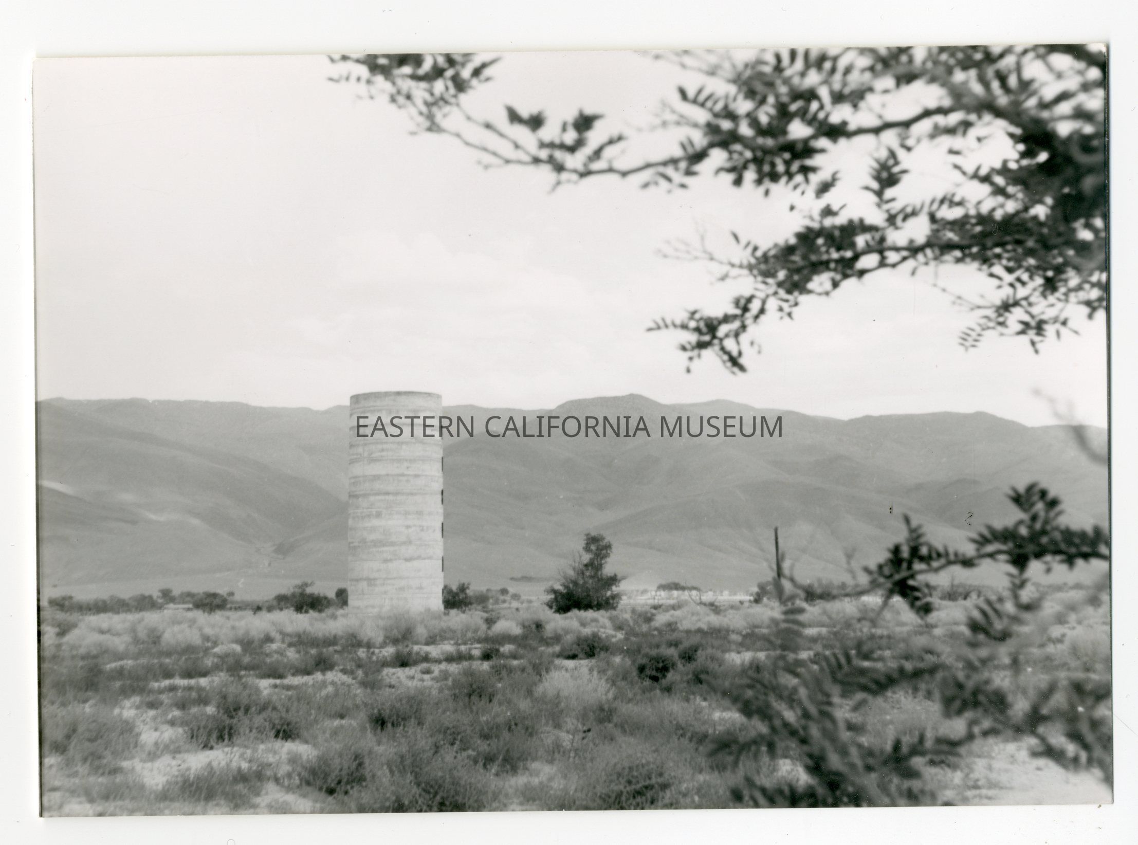 Photo of a silo with the Inyo or White Mountain range in the background. Written on reverse: Farrington.