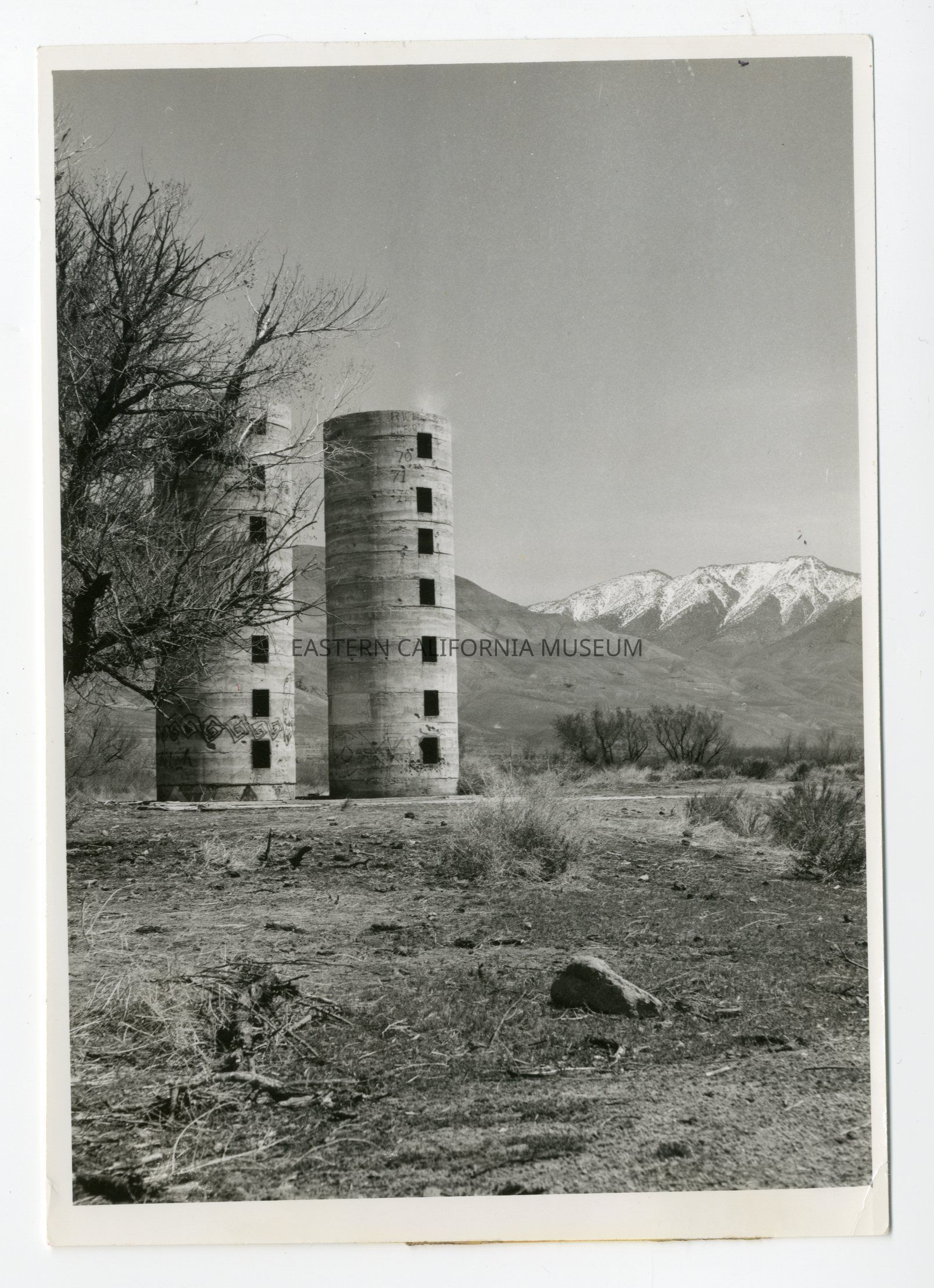 Photo of two silos. Written on reverse: Shuey. South of Poleta Bridge.