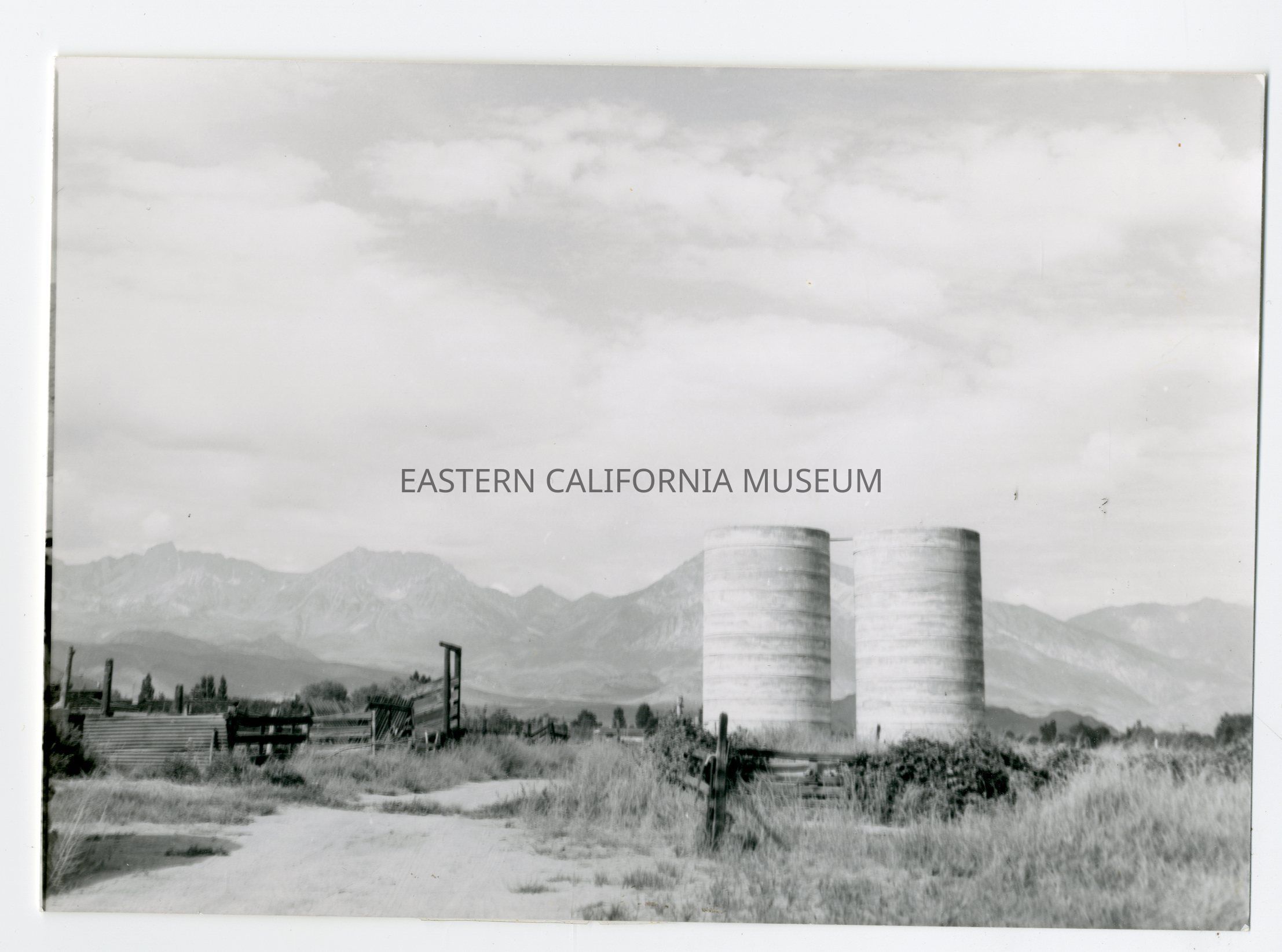 Photo of two silos next to a corral and livestock ramp. The Sierra Nevada mountain range is visible in the background.