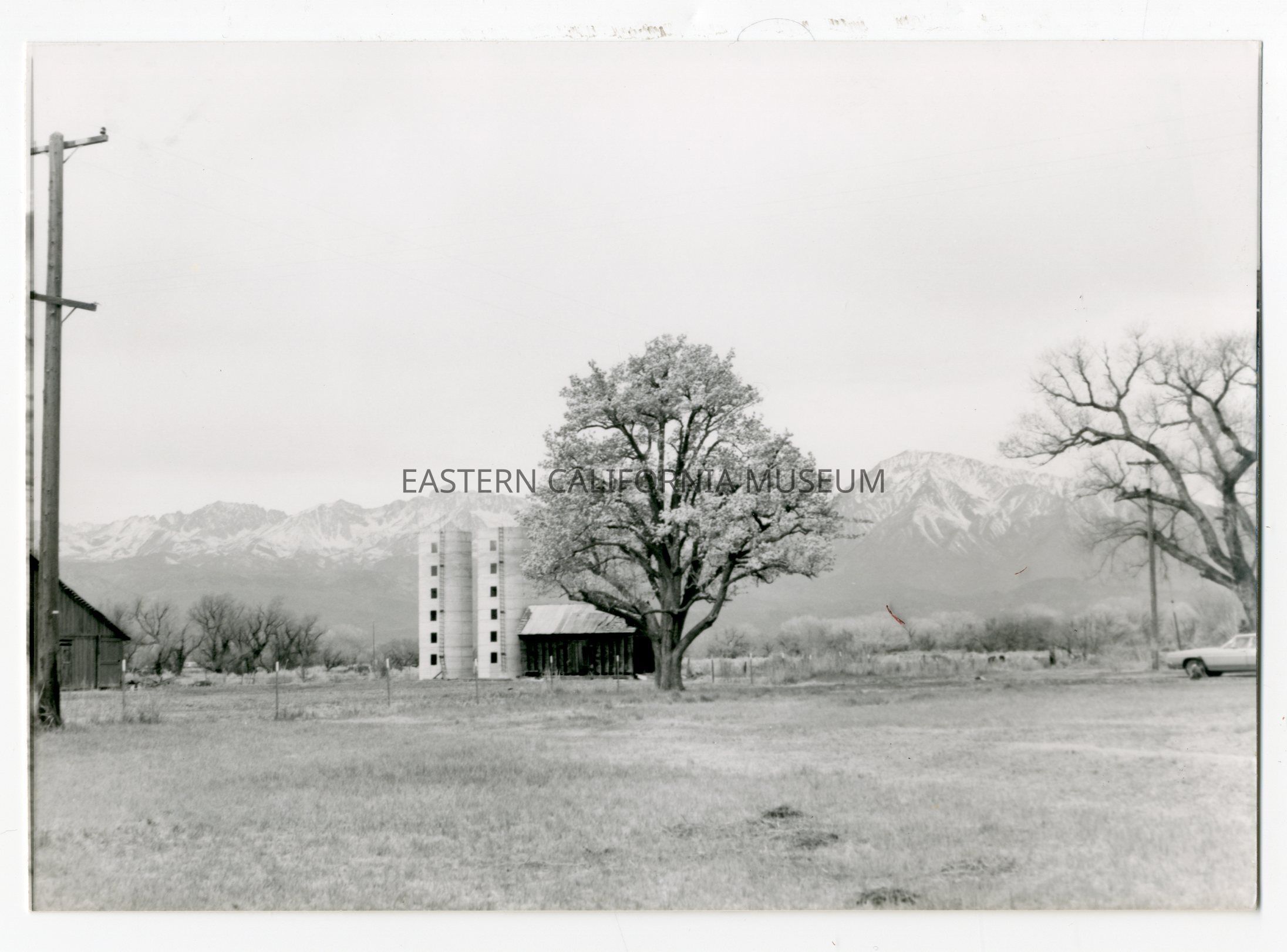 Photo of two silos, a barn, trees, a wooden structure, and the Sierra Nevada mountain range. Written on reverse: Williams.