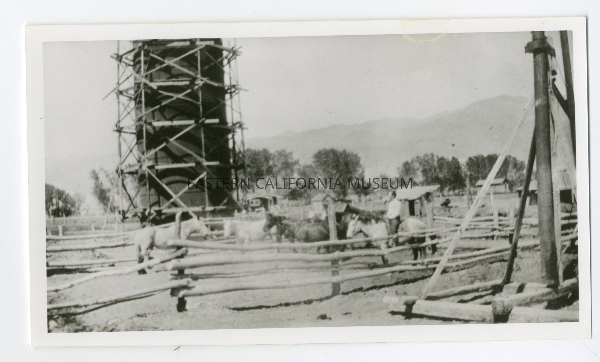 Photo of a corral with a man on horseback. In the background a silo is being constructed with scaffolding around it.