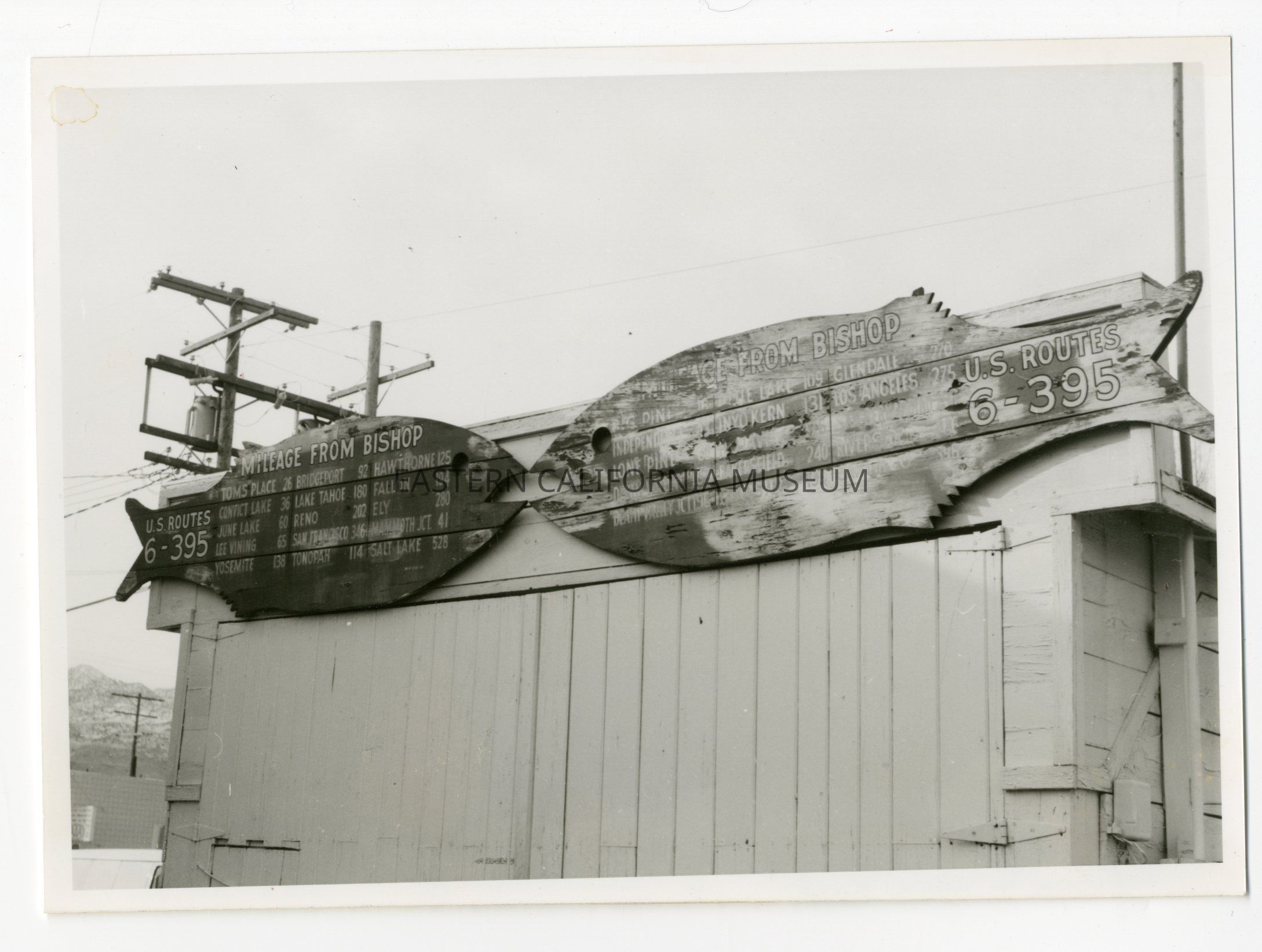 Photo of two iconic red fish signs showing the mileage from Bishop along U.S. Routes 6 and 395. They were made by Lemoyne A. Hazard.