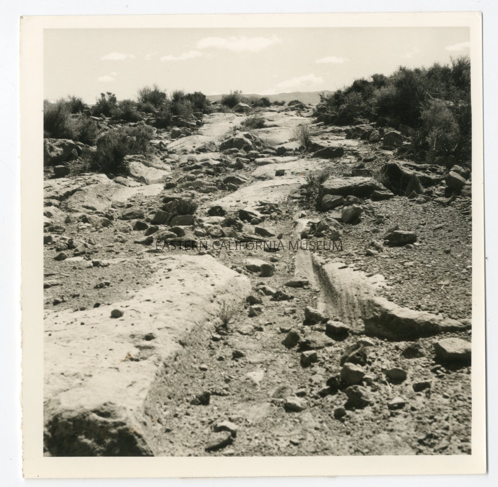 Photo of what appears to be an old road up a hill. Maybe Sherwin Grade? Written on reverse: Northern Mines.