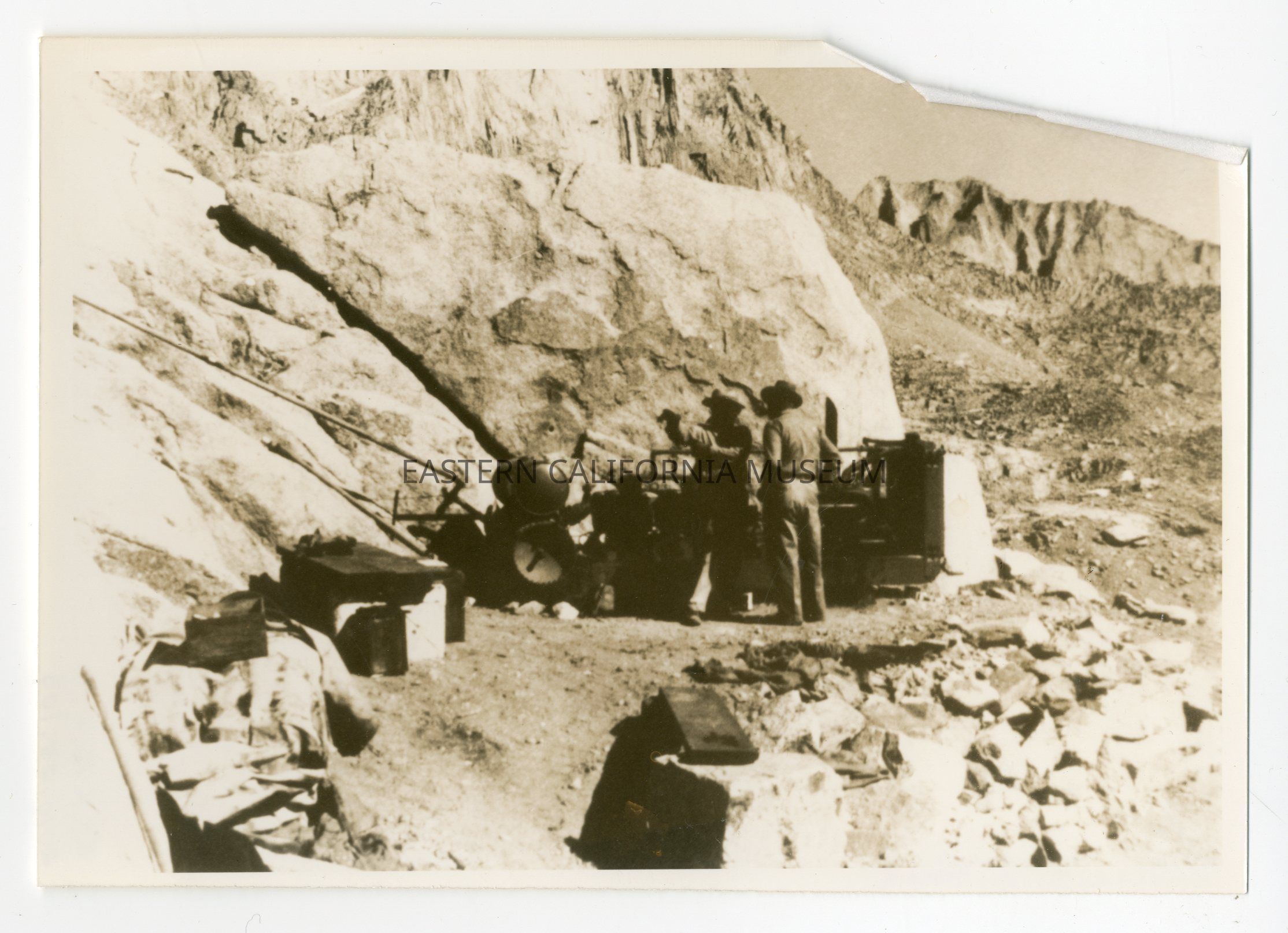 Photo of two men surrounded by a bunch of equipment next to a giant boulder. Possibly constructing a road?