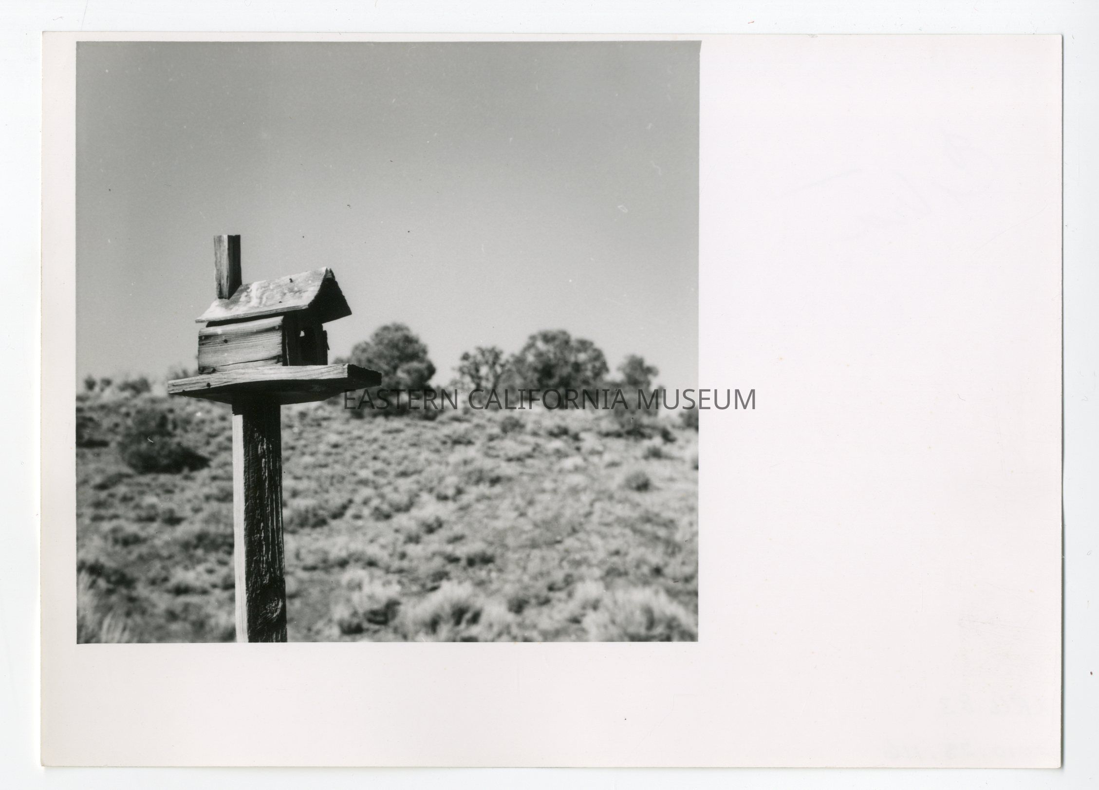 Photo of a wooden birdhouse on a post. Written on reverse: Extra.