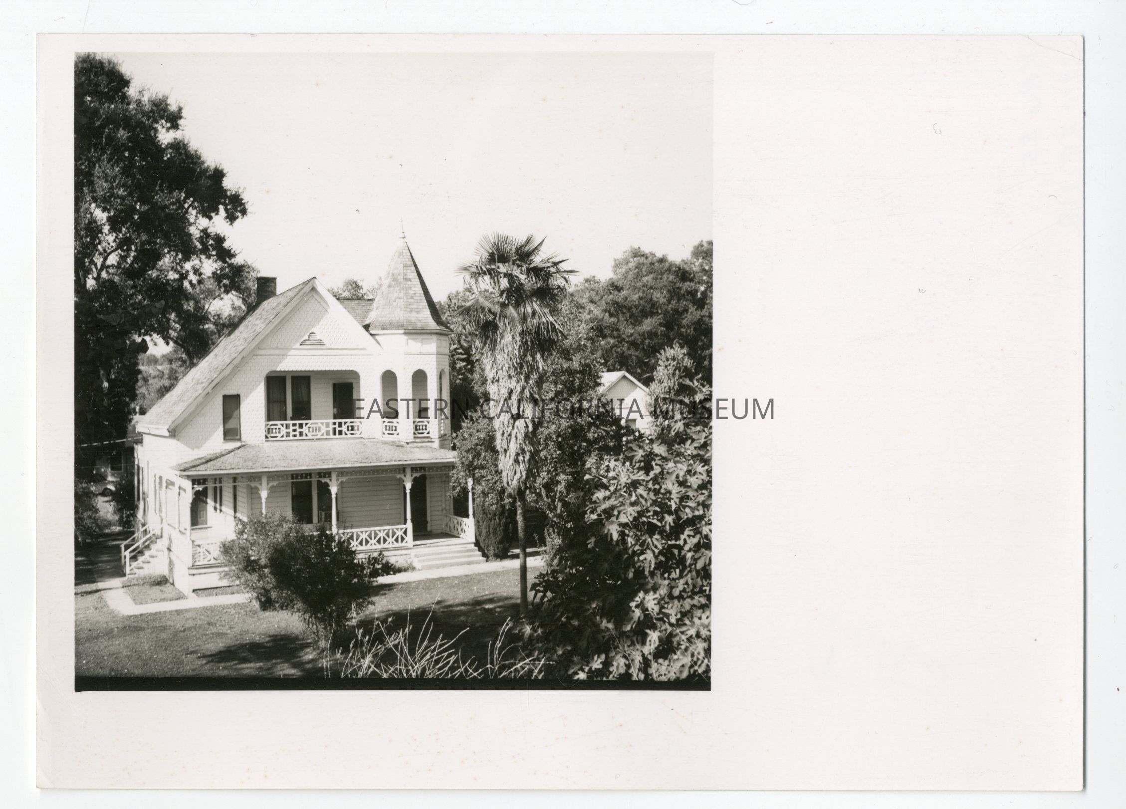 Photo of a two story white house with a round turret. It is surrounded by trees, including a palm or date tree. Not from this region.