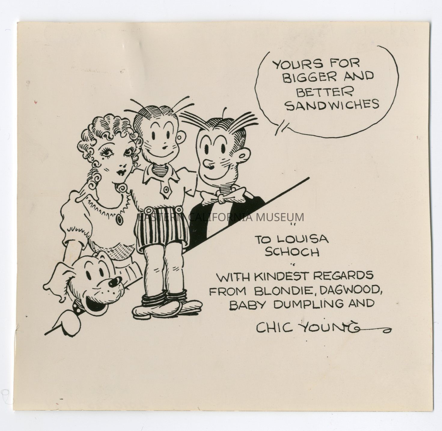 Comic featuring Dagwood and family saying, "Yours for bigger and better sandwiches." Written below is, "To Louisa Schoch, with kindest regards from Blondie, Dagwood, Baby Dumpling, and Chic Young.Collection