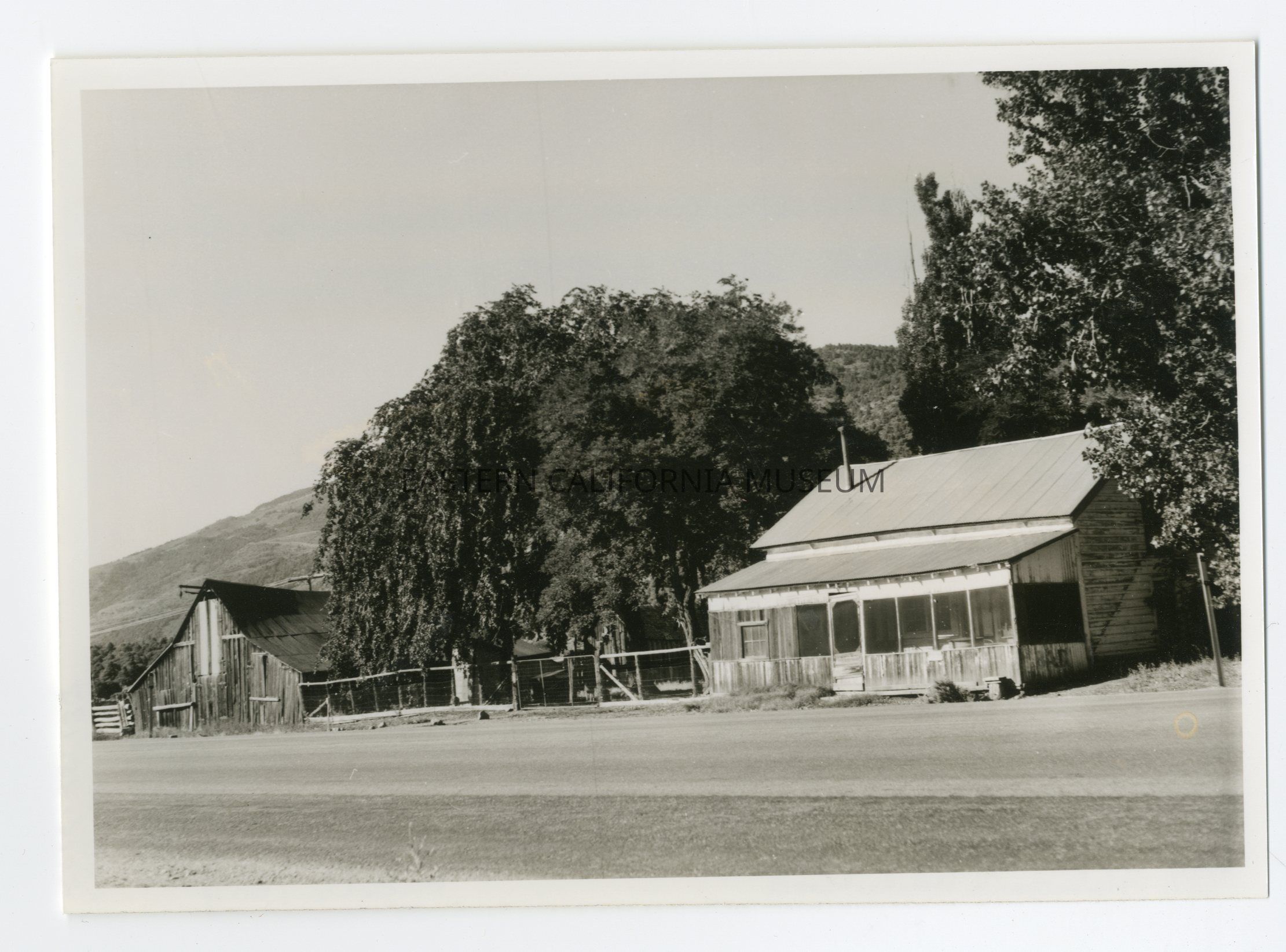 Photo of a wooden house with enclosed porch. A big tree separates the house from a barn. Written on reverse: Saddlebag.