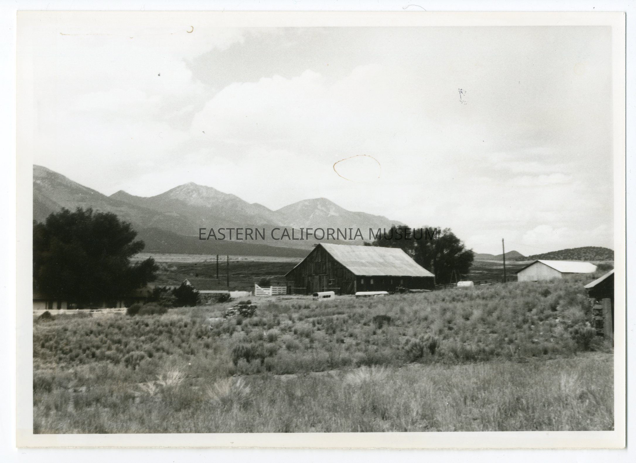 Photo of a barn with mountains in the background. Written on reverse: Saddlebag.