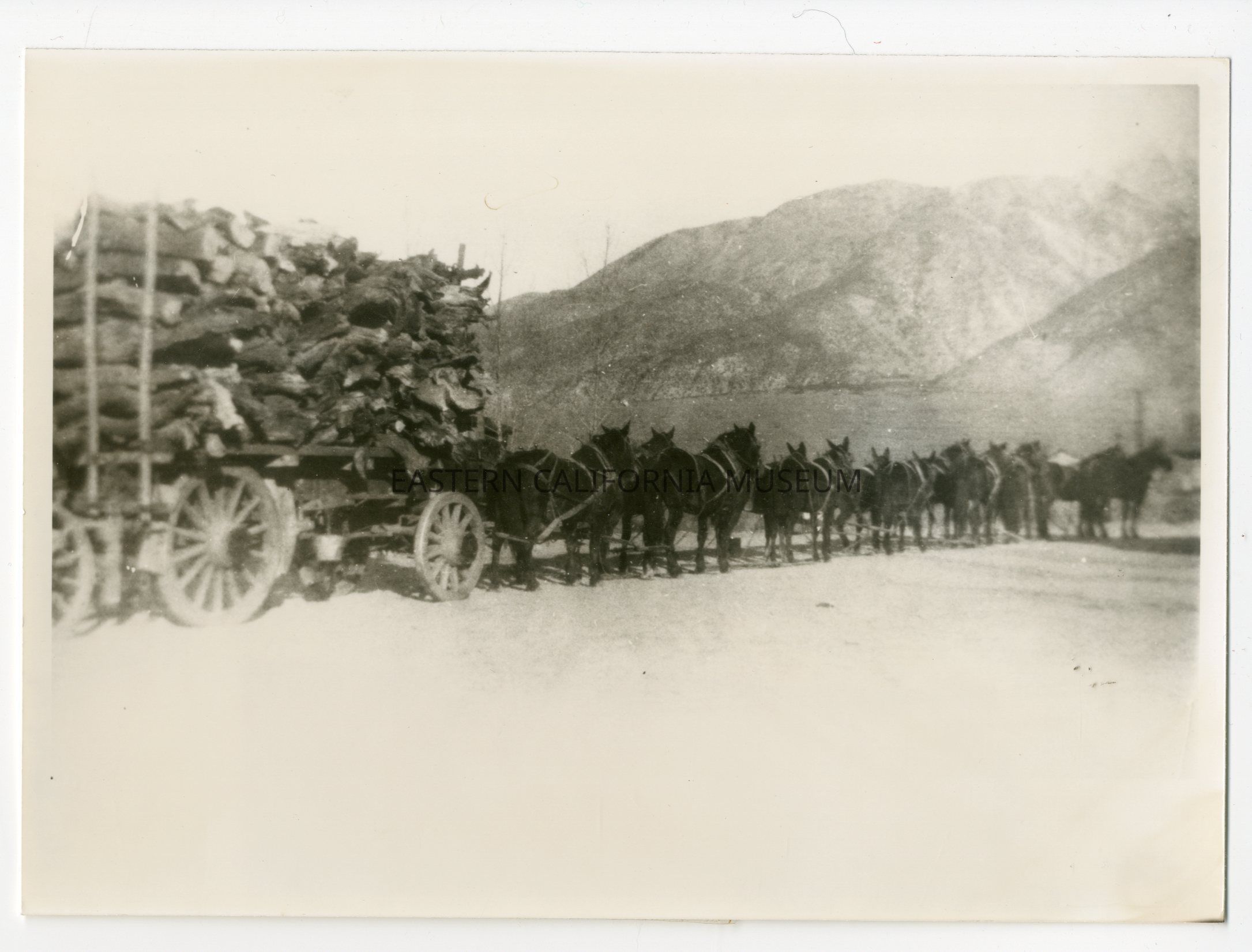 Photo of a team of 12-14 horses pulling a wagon piled high with firewood.