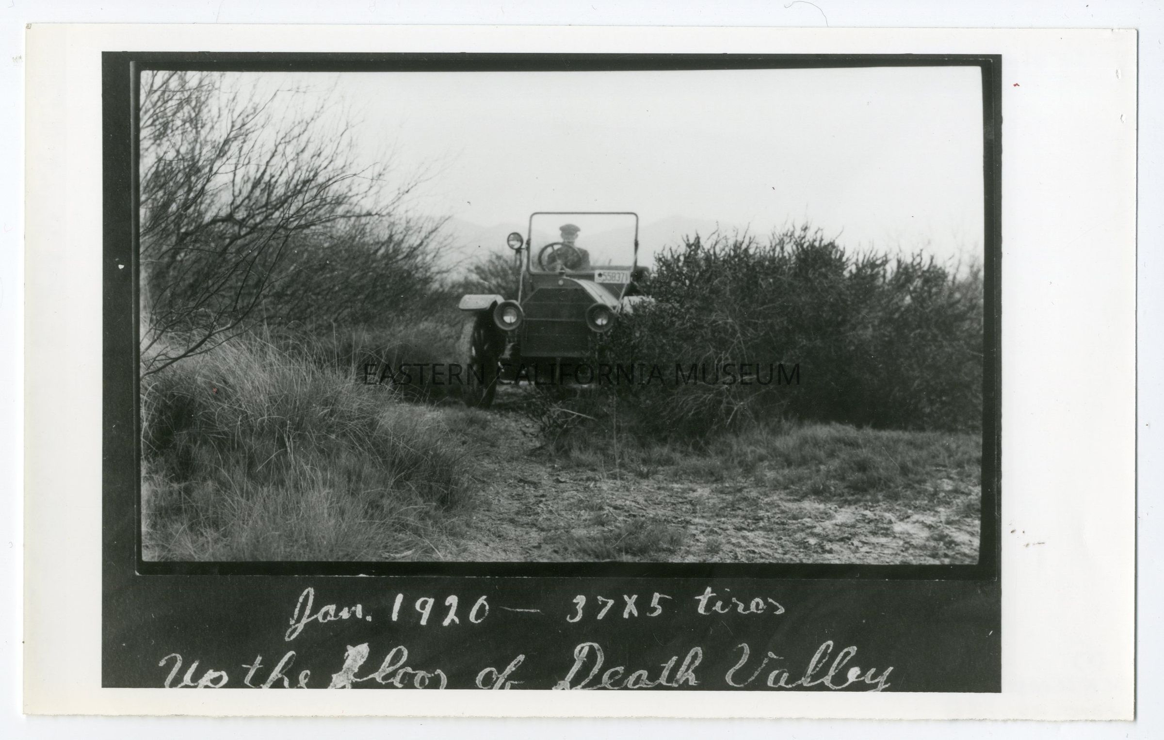 Photo of a man sitting behind the wheel of an early automobile. The caption under the photo says, "Jan 1920 -- 37x5 tires. Up the floor or Death Valley.