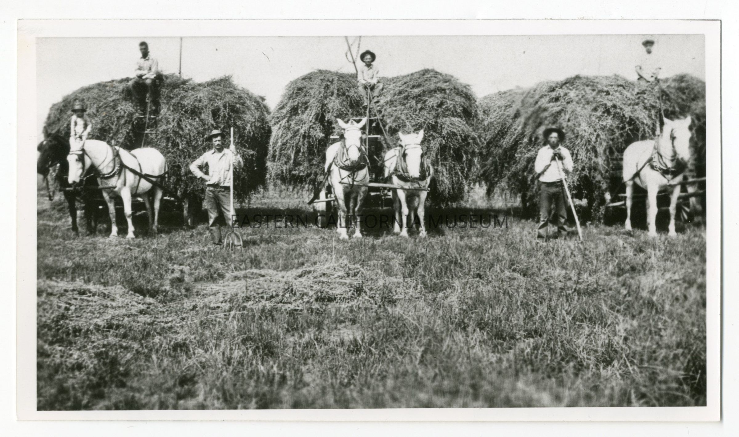 Photo of three wagons full of hay. There are three men driving the wagons, each pulled by two horses, and two men with pitchforks. There is a third person on the leftmost horse.