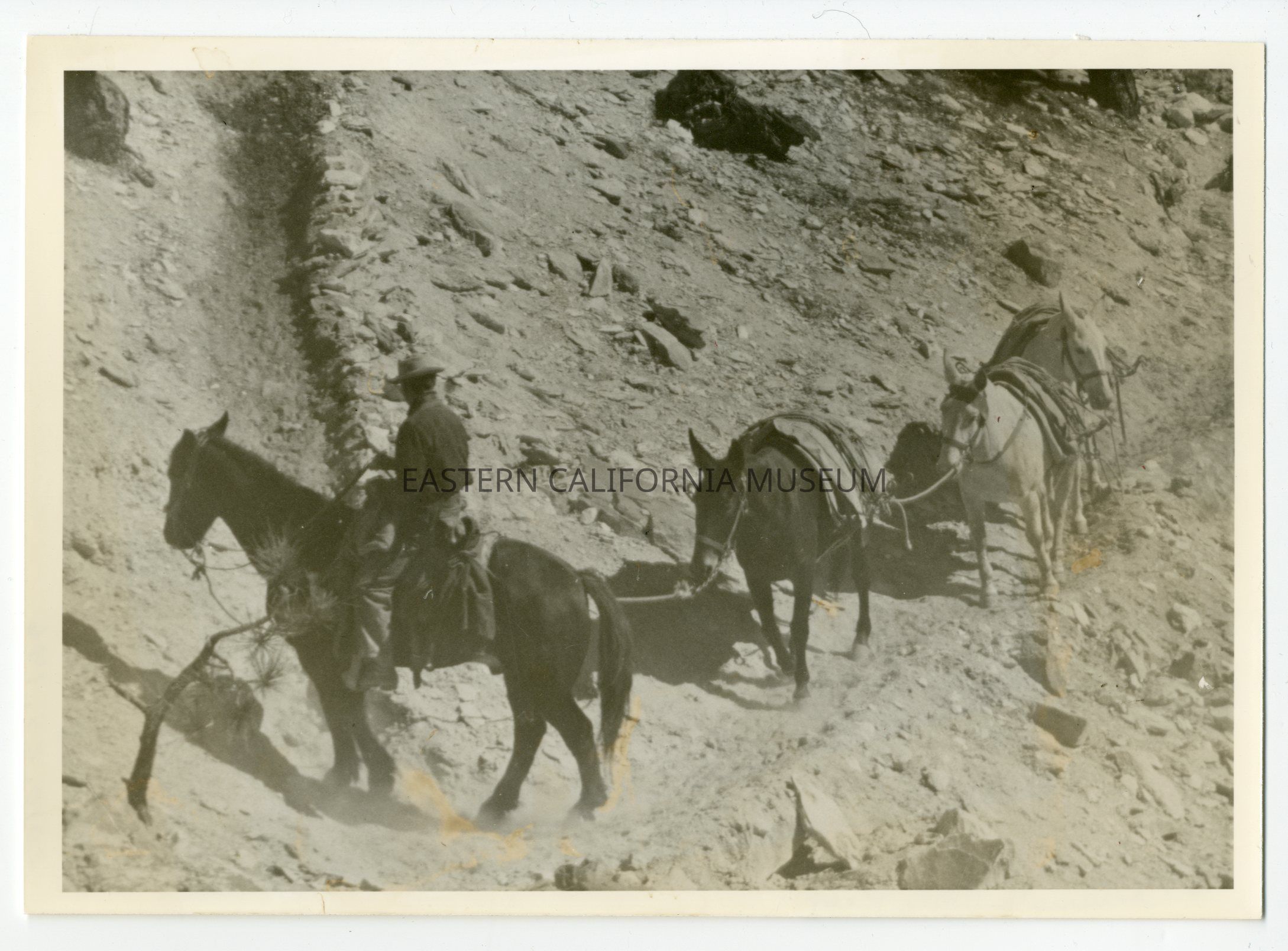 Photo of a man on horseback leading a train of three mules or horses along a trail. Written on reverse: Northern Mines. E. K.