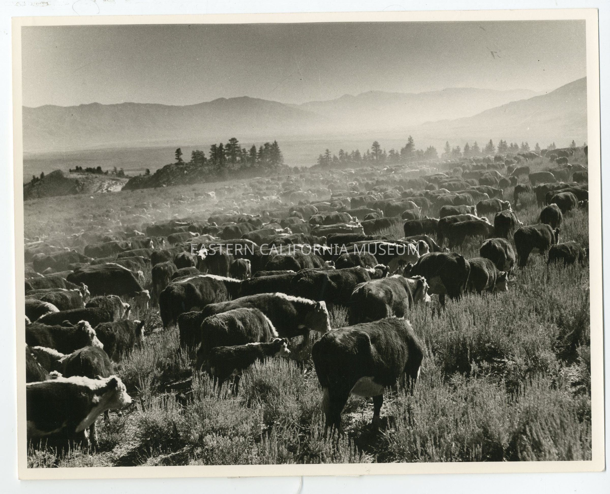 Photo of a herd of cattle walking through the sagebrush. Mountains and valley visible in distance.