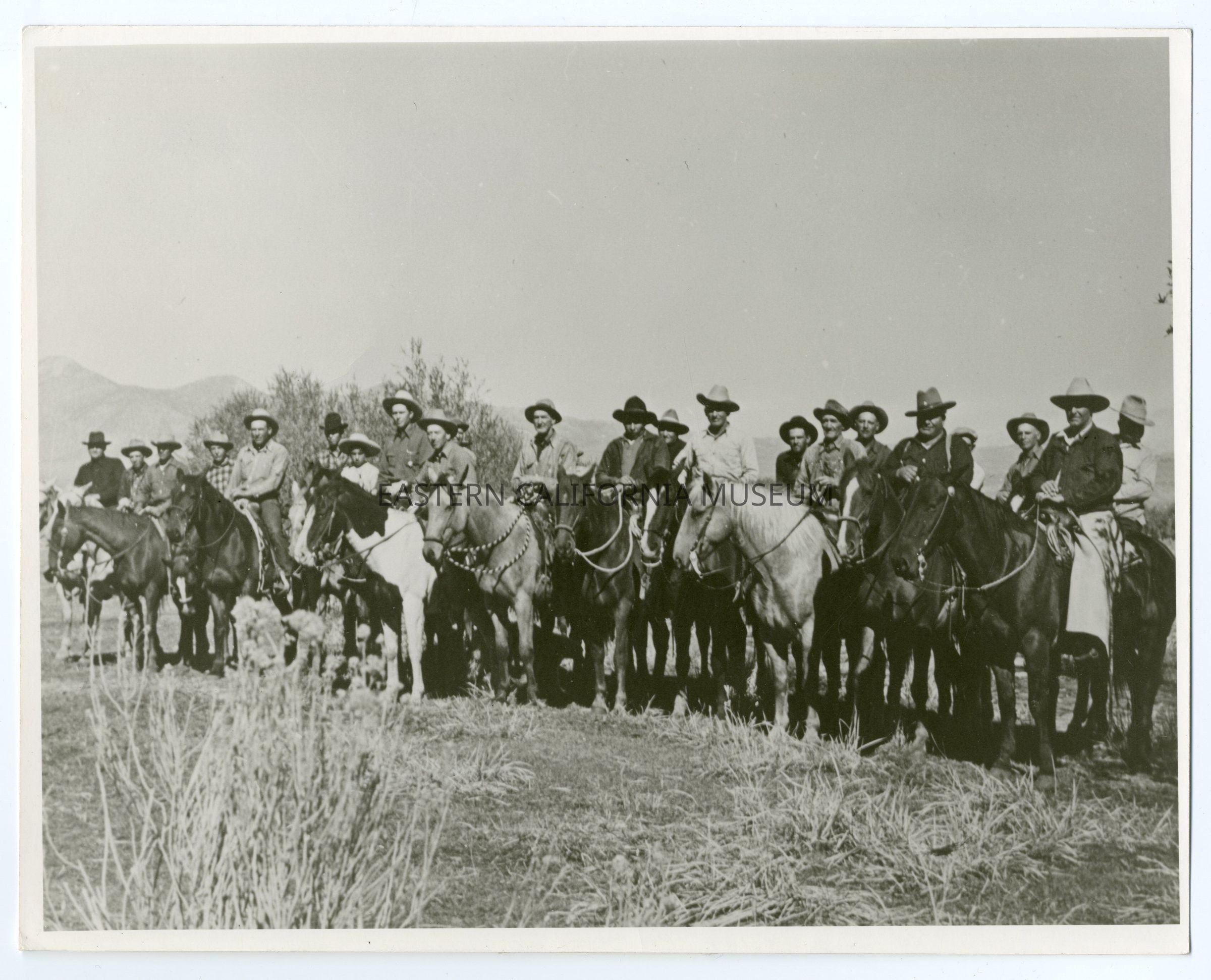 Photo of a large group of men lined up on horseback. Written on reverse: Cattlemen.