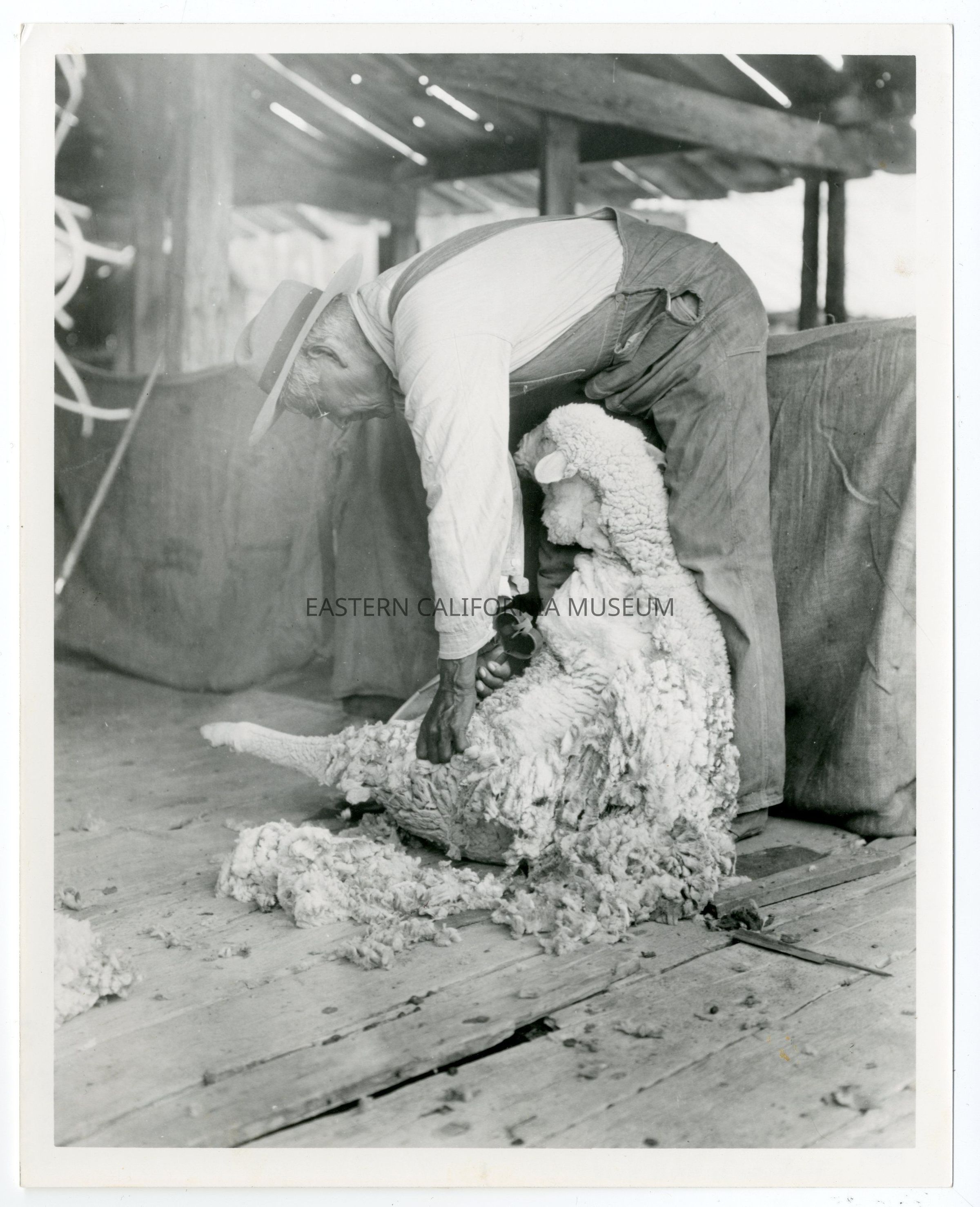 Photo of a man shearing a sheep of its wool. Written on reverse: Sheeping was Big Business.