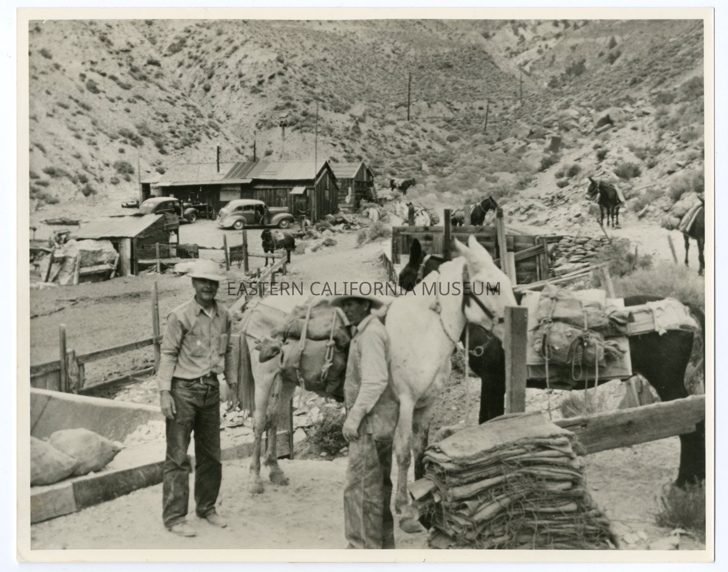 Photo of two men men next to two saddled horses. There is a wooden cabin in the background with two automobiles parked in front.