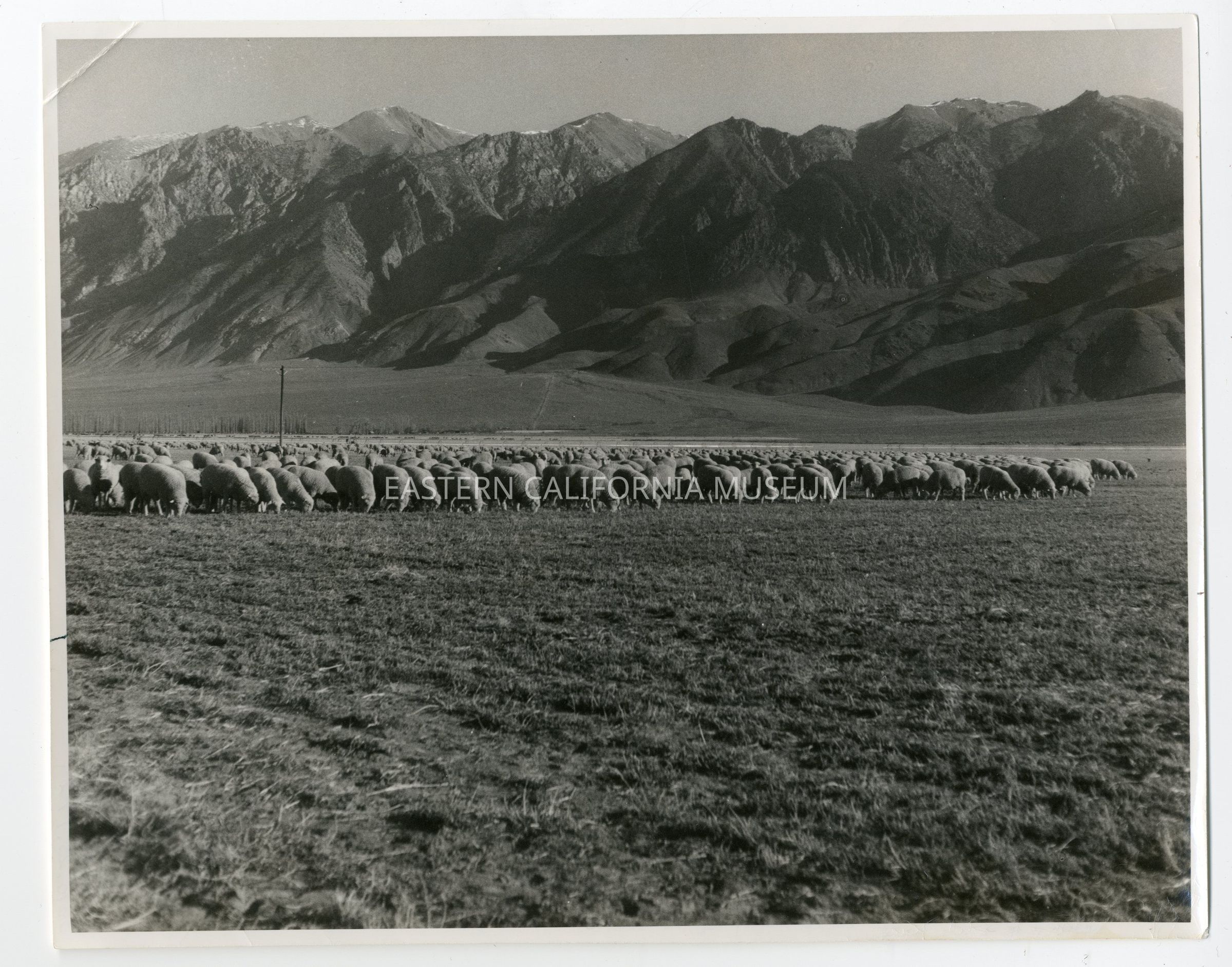 Photo of a flock of sheep with mountains in the background. Written on reverse: History of Benton.