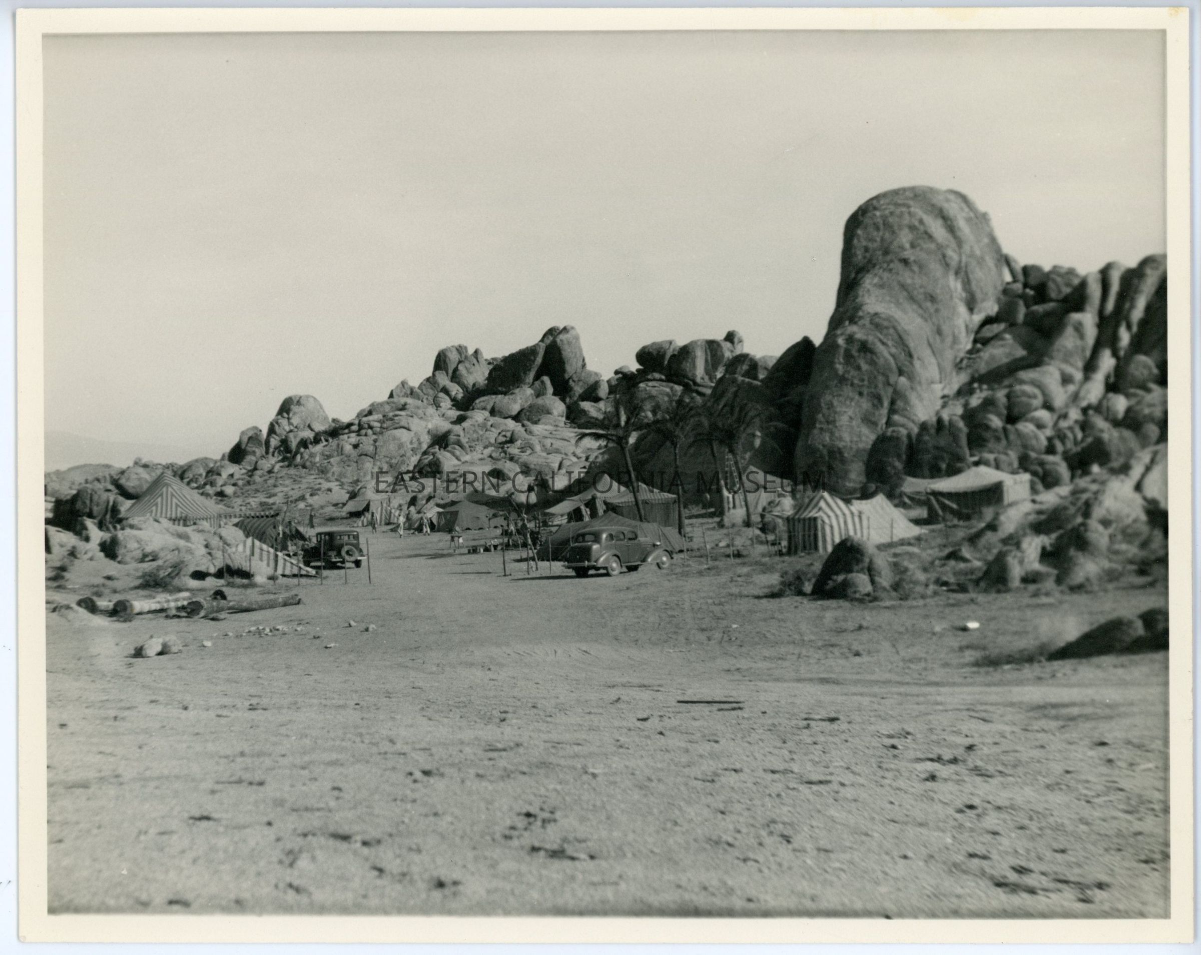 Photo of several tents (most with jaunty stripes) and automobiles in the Alabama Hills. There appear to be a few fake palm or date trees.Must be a movie set.