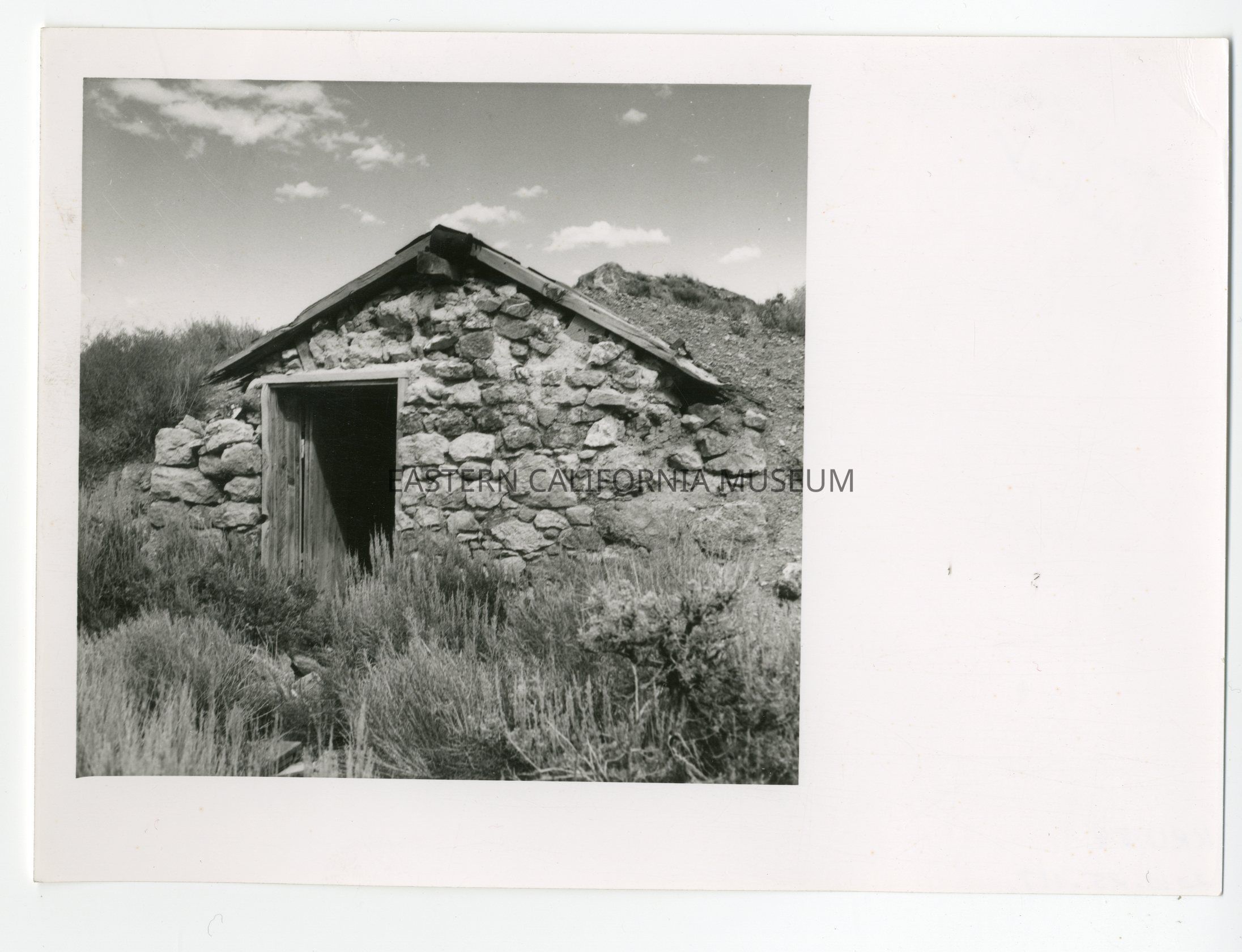 Photo of a stone cabin with an open wooden door. Written on reverse: Extra view, use best.