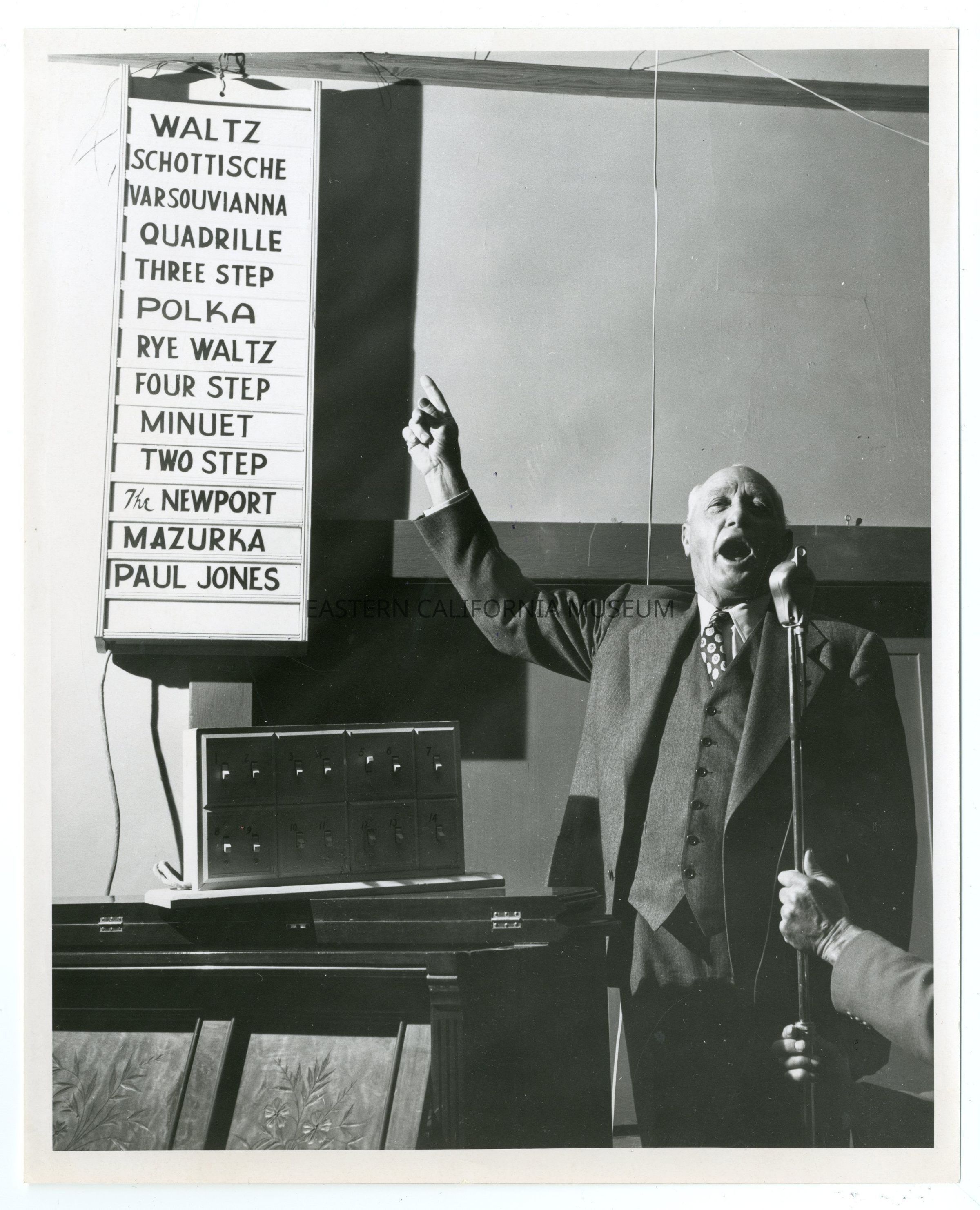Photo of a man standing in front of a microphone announcing the dances from a list. The list includes: waltz, schottische, varsouvianna, quadrille, three stop, polka, rye waltz, four step, minuet, two step, the Newport, mazurka, and Paul Jones.