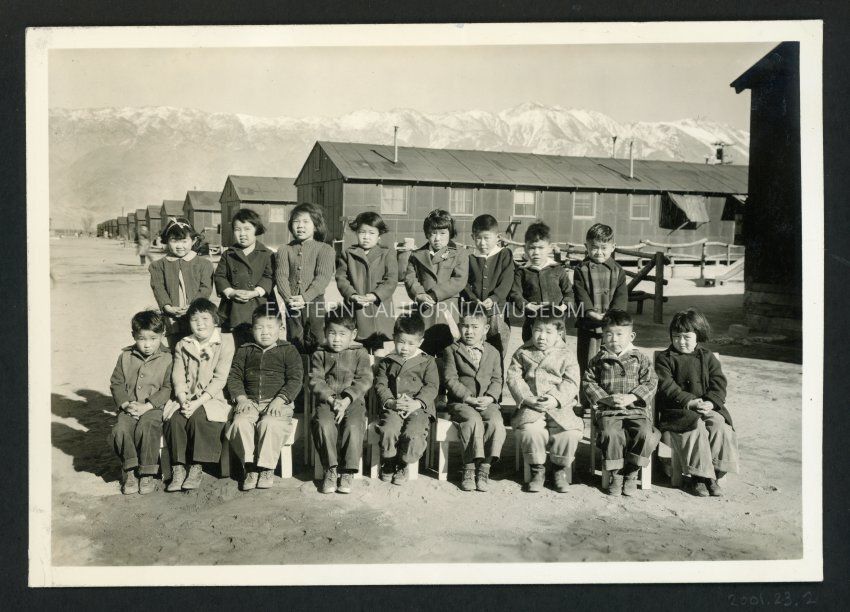Photo of what appears to be a group or class of school children. The front row is sitting in chairs while the back row is standing. All the children are wearing jackets, so photo may have been taken in the fall or winter. Long row of barracks visible with Sierra Nevada in background.Collection