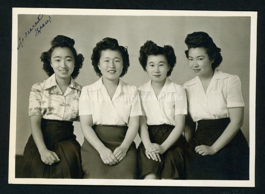 Studio portrait of four young women sitting. Inscribed in the upper left corner "To dearest Grace" and on the the waist of the second girl from left "Love, [illegible name]."Collection