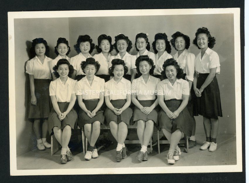 Studio portrait of a group of 14 young women. The front row is sitting in chairs while the back row is standing.Collection