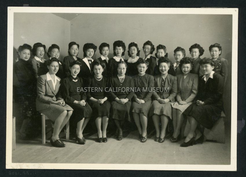 There is a blue sticky-note affixed to album page under this photo that says, "Seated R Yuriko 'Lily' Odahara Novack."Collection