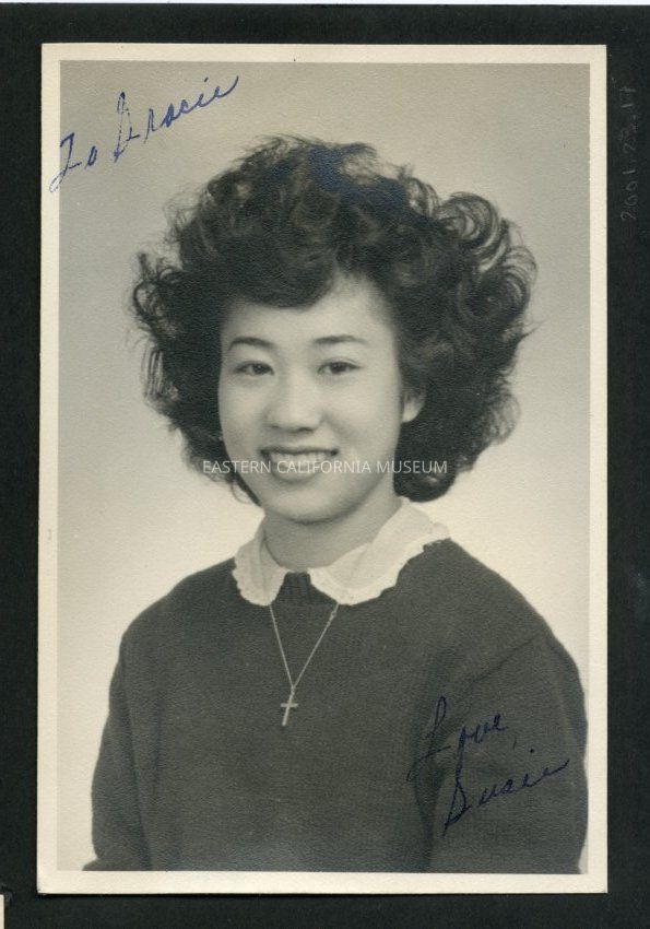 Studio portrait, maybe a school photo, of a young woman wearing a cross necklace. Inscribed in upper left corner "To Gracie" and in lower right corner "Love, Susie."Collection