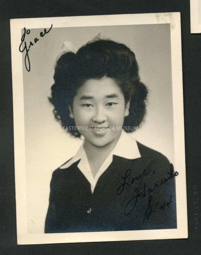 Studio portrait, maybe a school photo, of a young woman. Inscribed in upper left "To Grace" and in lower right "Love, Haruko S'44." Perhaps she was a Summer 1944 graduate from Manzanar's school system.Collection