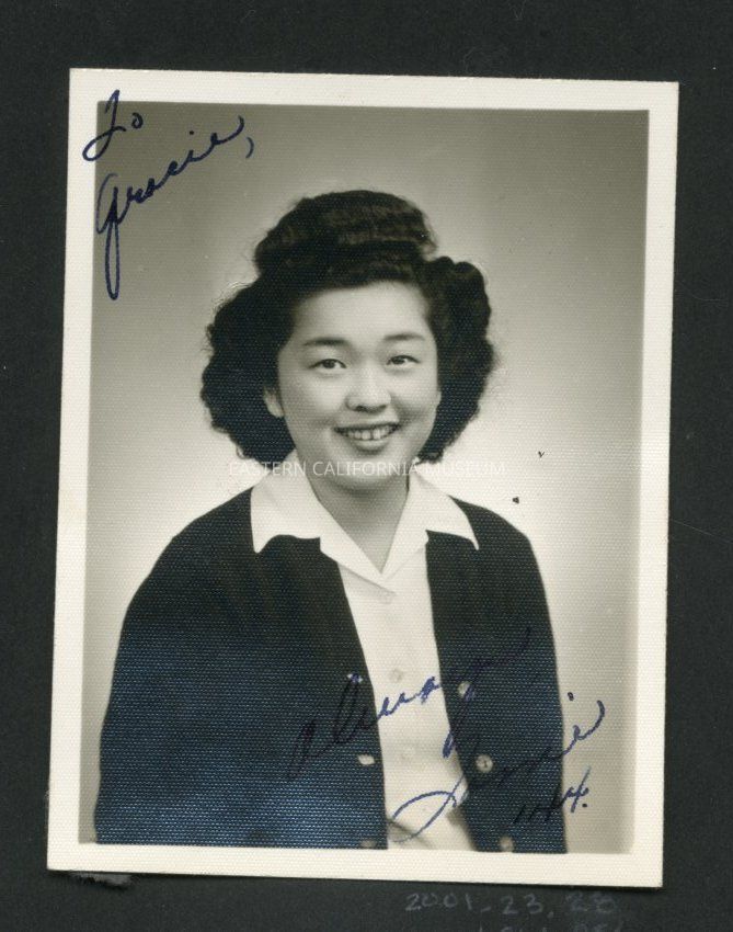 Small studio portrait, maybe a school photo, of a young woman. Inscribed in upper left "To Gracie" and in lower right "Always, Tomi '44."Collection