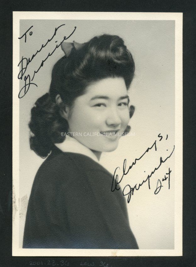 Studio portrait, maybe a school photo, of a young woman. Inscribed in upper left "To Dearest Gracie" and in lower right "Always, [illegible name] S44." Perhaps she was a Summer 1944 graduate from Manzanar's school system.Collection
