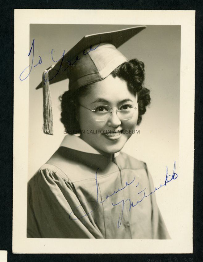 Studio portrait, maybe a school photo, of a young woman wearing a graduation gown, motoboard with tassle, and glasses. Inscribed in upper left "To Grace" and in lower right "Love, Mitsuko."Collection