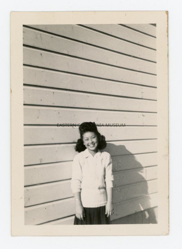 Small photo of a young woman standing in front of a wooden building (Manzanar auditorium?).