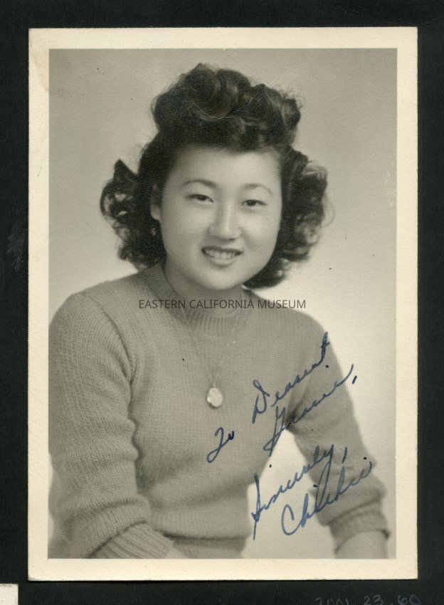 Studio portrait, maybe a school photo, of a young woman wearing a round pendant necklace or locket. Inscribed in lower right "To Dearest Gracie, Sincerely, Chi-- [illegible name]."Collection