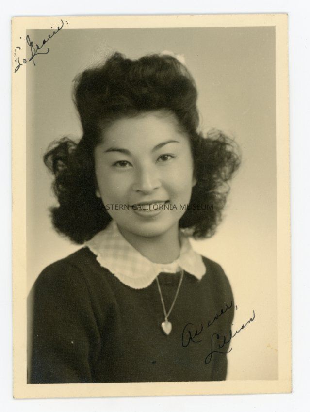 Studio portrait, maybe a school photo, of a young woman wering a heart necklace. Inscribed in upper left "To Gracie" and in lower right "As ever, Lillian."