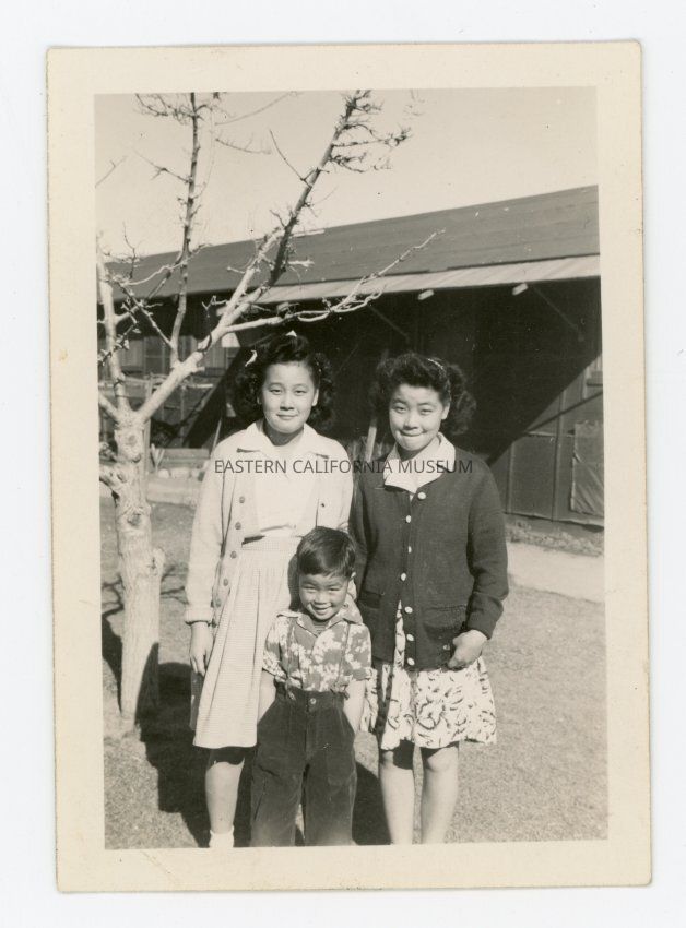 Small photo of three children standing outside on a lawn in front of what may be a barrack. Two older girls, and one younger boy. This photo and 2001.23.65 were taken in the same place on the same day, and the other has a note that the photo was taken in January 1945.