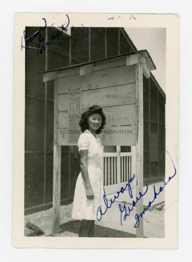 Small photo of a young woman standing in front of a wooden kiosk and what appears to be a barrack. Inscribed in upper left "Dear Grace" and in lower right "Always, Grace Imahara."