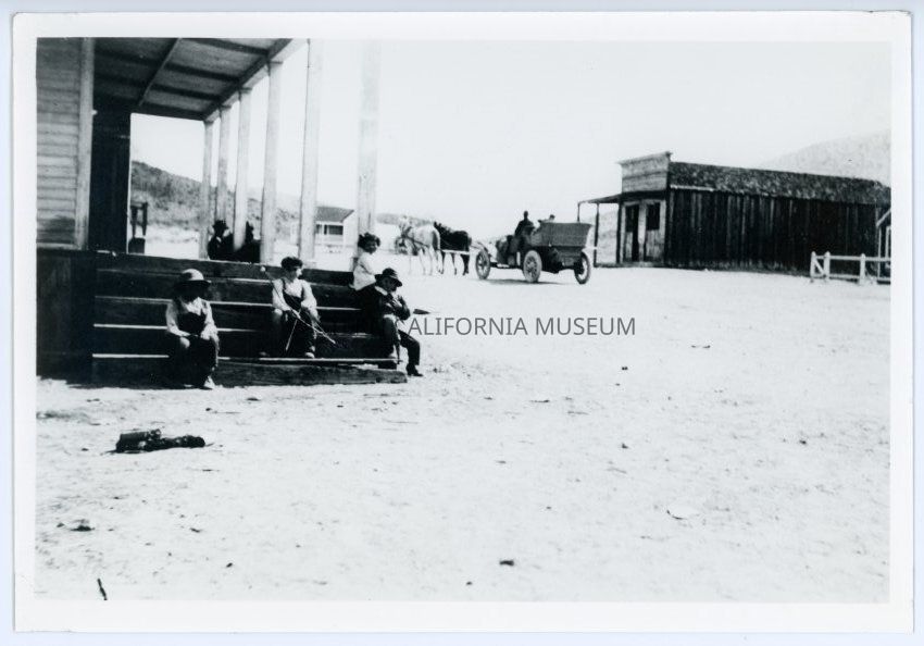 A photocopied paper written by Elizabeth Mecham says: How we started cars in 1916. Shows fence and corner of our house where our son was born--it is next to Black Metal Saloon--owned by Jack Gunn at that time--country was dry but Darwin had "local option"--next shows the Jack Gunn 1876 saloon. Behind car and team is old horse trough before Peterson [Petersen?] built--shows his tent, then Alex Rouna house built 1915 and Al and Vie Belen lived there. He tended bar for Gunn. On left shows steps and front porch of original hotel--Charlie Anthony's--also owned the store and barns and corrals--sold all to SIlas Reynolds and Domingo Etcharen 1904-5. Boys on step--little Alex Rouna, Wallace Campbell, Jimmy Cathery--he and Alex Indian boys--then Josephine Loughrey. A small bit of the top of tamarisk trees in front of Cathery's and fence around them--still growing! 1876. The 2 blocks on right burned down Aug. 17, 1917 and 2 blocks on left burned July 7, 1918.