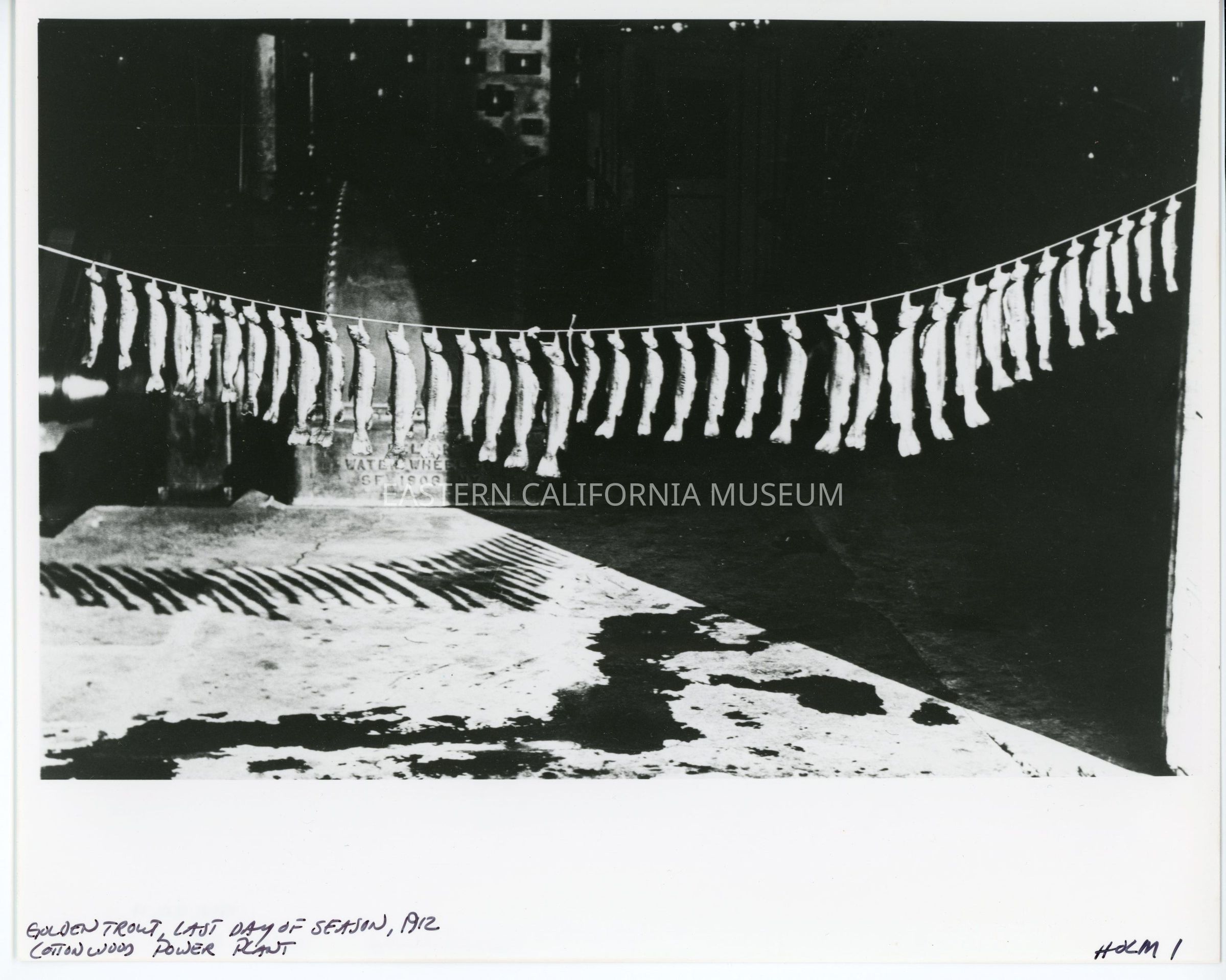 1998.20.4--Close up of golden trout on a stringer across the open doorway. What looks like a Pelton water wheel is inside.