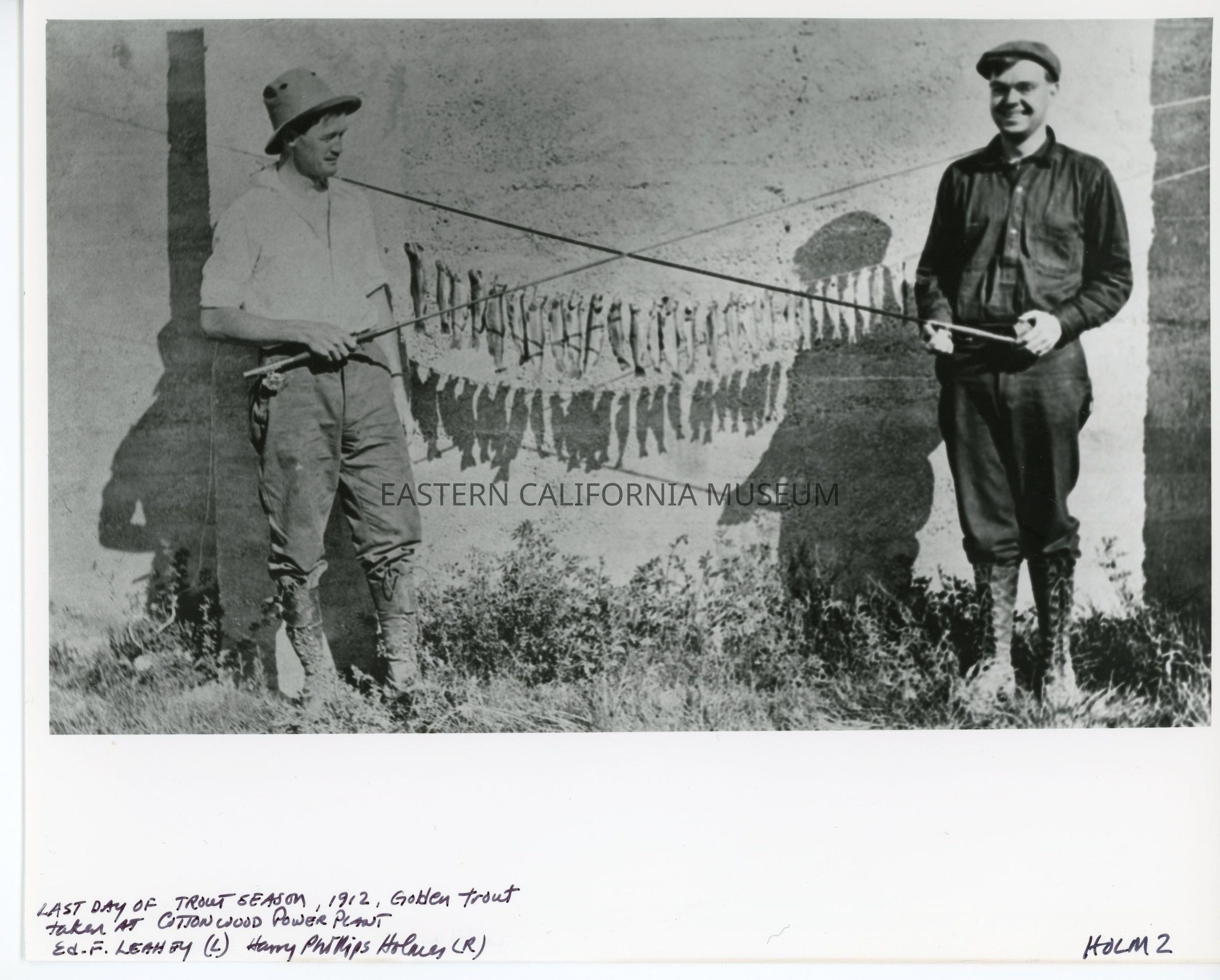 1998.20.5--Edward F. Lehy is on the left and Harry Phillips Holmes is on the right. Golden trout on a stringer against side of building. Both men are holding crossed fishing poles.
