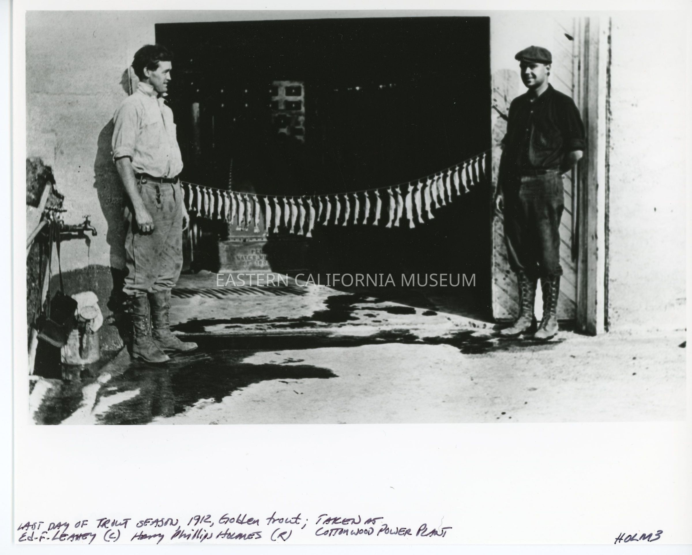 1998.20.6--Edward F. Lehy is on the left and Harry Phillips Holmes is on the right. Golden trout on a stringer across the open doorway. What looks like a Pelton water wheel is inside.Photograph Details