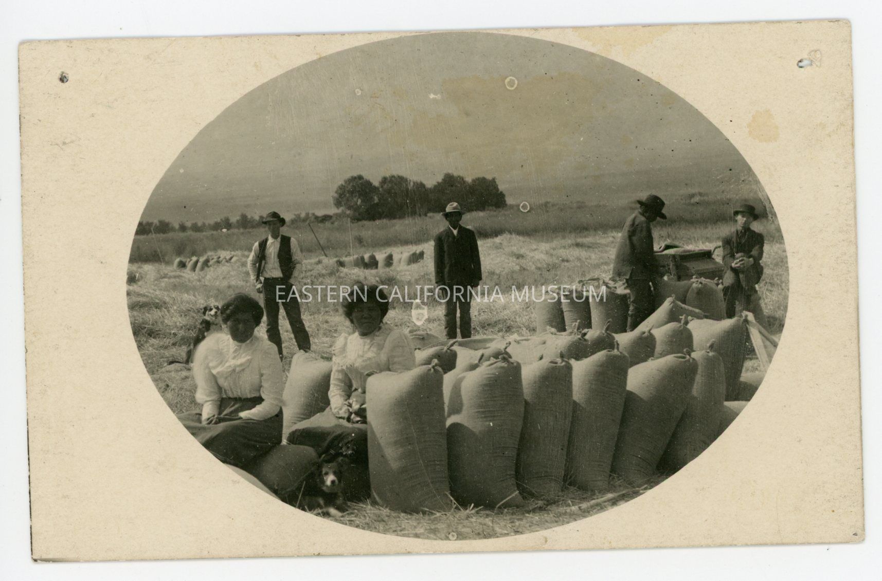 Photo postcard of six people (two women, four men), two dogs, and many bags full of whatever they are harvesting (grain?) at Gorman Ranch at Fort Independence. The two women and one or two of the men appear to be Native American. The man on the far right appears to be sitting at what may be a thresher machine. There are two pinholes in the upper corners of the postcard.