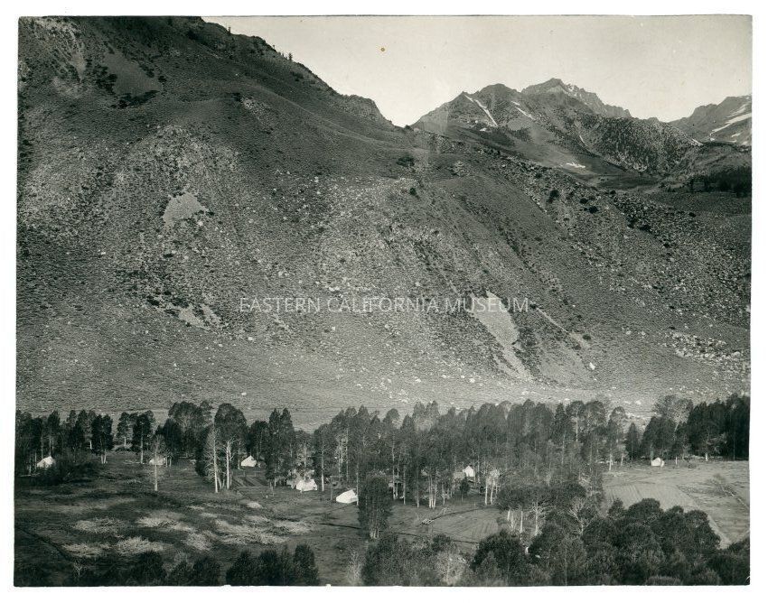 Photo taken from a high vantage point looking down at many canvas tents spread out amongst a grove of trees at the base of a mountain. There appears to be cleared and plowed fields towards the right side, and some log or wood cabins as well. Possibly Andrew's Camp?